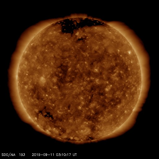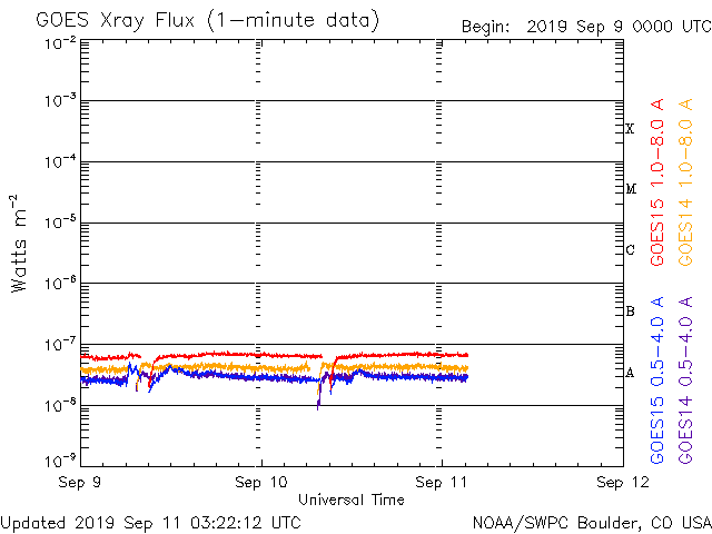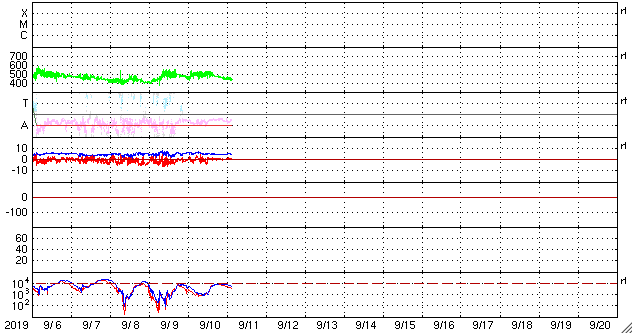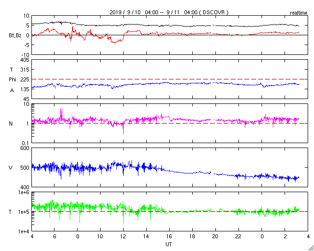 - 2019/ 9/ 9 12:46 太陽風は平均的な状態です。イエローナイフのオーロラをどうぞ。