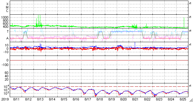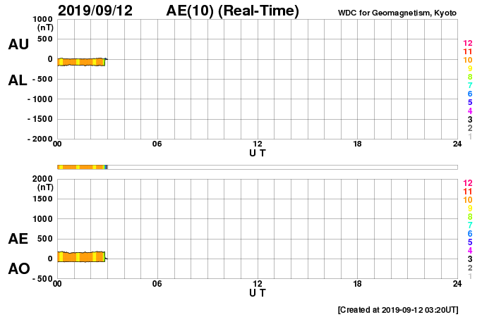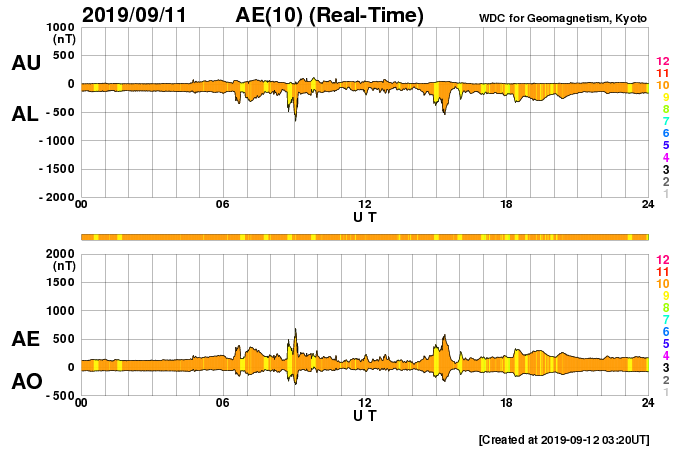 下段のAEグラフの値が高くなると、オーロラ活動が活発化しています。