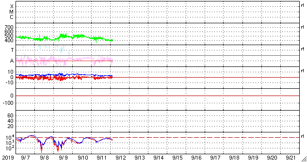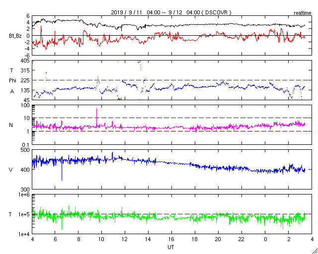 - 2019/ 9/11 12:24 太陽風の速度は440km/秒に下がっています。磁気圏は穏やかです。