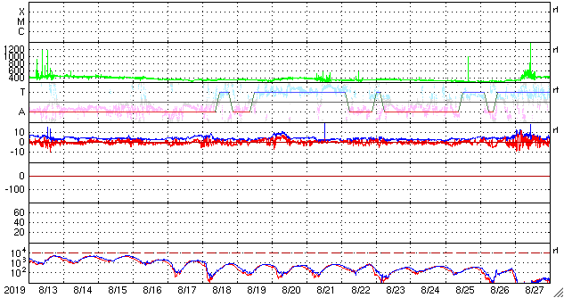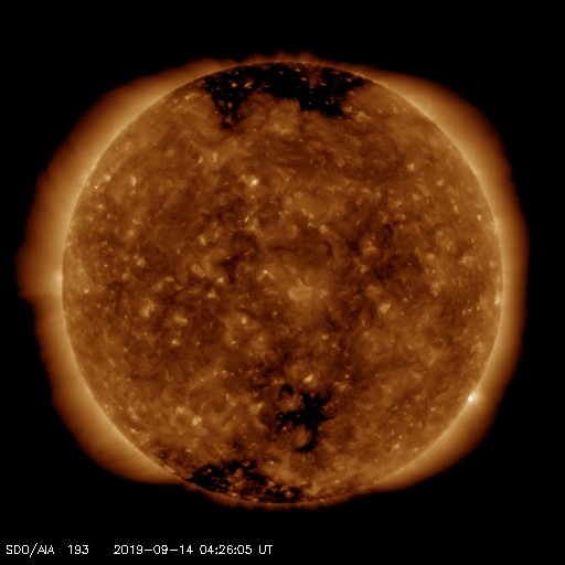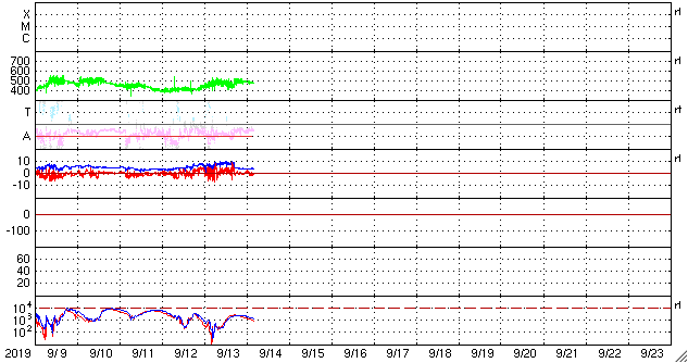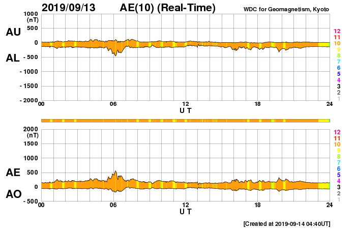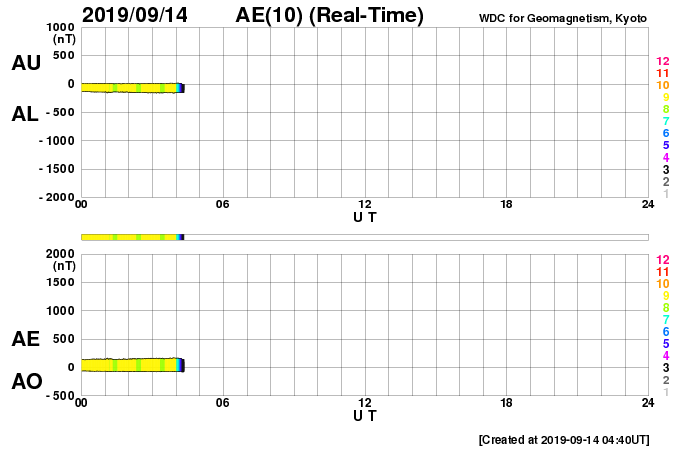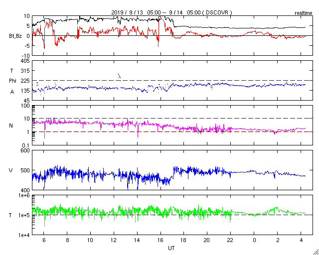 2019/ 9/14 13:40 更新 太陽風は500km/秒の高速風になりました。イエローナイフのオーロラをどうぞ。 担当 篠原 高坂雄一さんより、カナダ・イエローナイフで、 現地11日の夜(世界時12日午前)に撮影されたオーロラの写真をいただきました。 太陽風の高まりが終わり、速度も磁場強度も平均的な状態になっていましたが、 磁場が南向きに変化して、AE指数に500nTの中規模の変化が起きた頃です。 高坂さんによると、現地11日の夜は、 22時(世界時12日4時)頃に少しオーロラが現れた後、 12日1時(世界時12日7時)までほとんど見えない状態だったそうですが、 そこから急に大きく出始めて、 縦筋からブレークアップまで全天がにぎやかだったそうです。 月が明るいので空が青くきれいだったとのことです。 緑のオーロラの下端のピンク色がとてもきれいです。 現地では、連日素晴らしい光景が繰り広げられているようです。 最新情報をどうもありがとうございます。 太陽風の速度はもう一段高まって、500km/秒の高速風に達しています。 磁場強度は、昨日いっぱいは8nTくらいに高まっていましたが、 その後、4nTに下がっています。 速度も、グラフの最後は470km/秒へ少し下がっています。 小さい高まりですが、前周期の太陽風とは違う変化になっています。 この辺りで終わるのか、この後も続くのか、 引き続き注目してください。 太陽風磁場の南北成分は、 グラフの前半は北寄りで、後半は0nT付近になっています。 このため磁気圏は穏やかで、AE指数は目立った変化は起きていません。 SDO衛星AIA193では、南半球の中緯度域にコロナホールが見えています。 緯度が高めなので、影響は小さいと思われます。 27日周期の図では、前周期の太陽風は穏やかな状態が続いています。 太陽は、無黒点で穏やかです。
