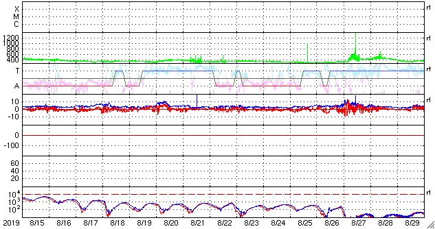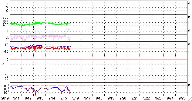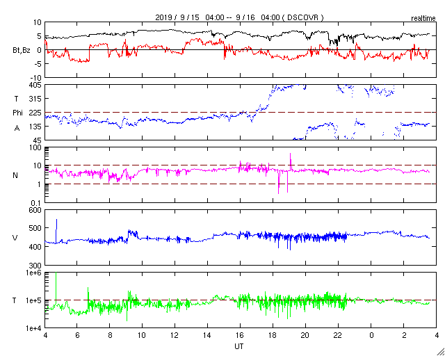 - 2019/ 9/15 09:45 太陽風は平均的な速さに戻り、磁気圏も穏やかです。
