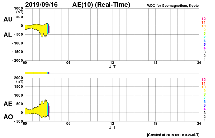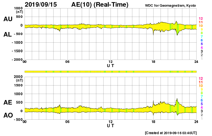 下段のAEグラフの値が高くなると、オーロラ活動が活発化しています。