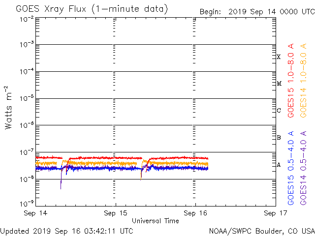 - 2019/ 9/12 12:31 太陽風の速度は400km/秒に下がっています。無黒点が続いています。