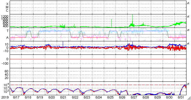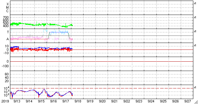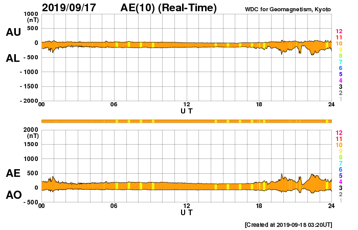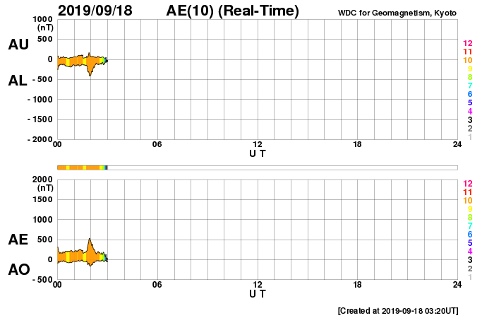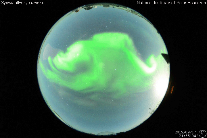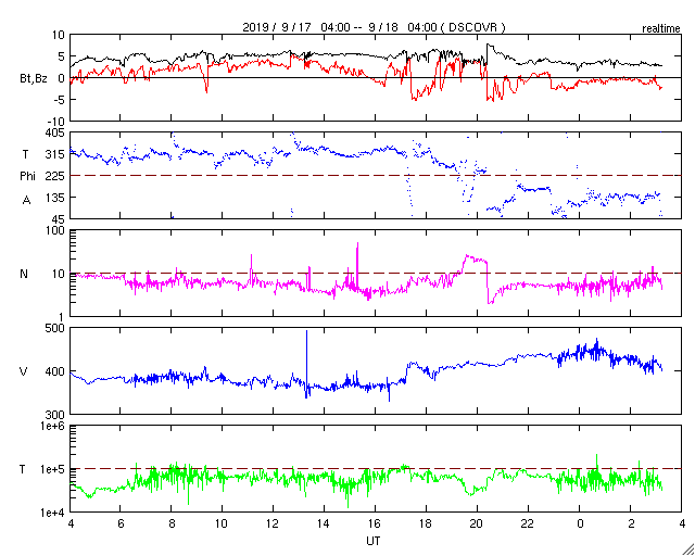 2019/ 9/18 12:23 更新 太陽風の速度は400km/秒前後を推移しています。 担当 篠原 太陽風の速度は、 昨夜にかけて400km/秒から360km/秒へ下がりましたが、 今日に入ると再び高まって、450km/秒に達しました。 現在は元に戻って400km/秒です。 速度は、下がりそうで下がらないという状態が長く続いています。 27日周期の図を見ると、 前周期の8月27日に速度の高まりが見えています(読み取りにくいですが)。 もう5日ほどすると、この高速風の回帰が始まる可能性があります。 太陽風の強度は、5nTから3nTへ少し弱くなっています。 南北成分は、-5nTの南向きの変化が2回ほど発生しています。 そのタイミングで磁気圏の活動もやや高まり、 AE指数で500nTの変化が発生しています。 2つめの高まりにあたる、世界時17日22時頃のオーロラの様子を、 昭和基地の全天カメラの動画で紹介します。 例年、昭和基地の写真の更新は10月中旬までです。 残り1か月になっています。 SDO衛星AIA193では、 太陽の東側(左側)の赤道域にコロナホールの暗い領域が見えています。 前周期の8月27日の高速風はこの領域と関係しています。 まだ斜めから見ていますが、広がりが小さくなっている様です。 太陽は、無黒点で穏やかです。