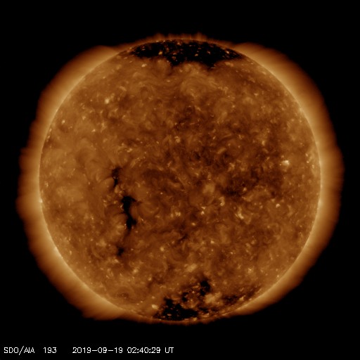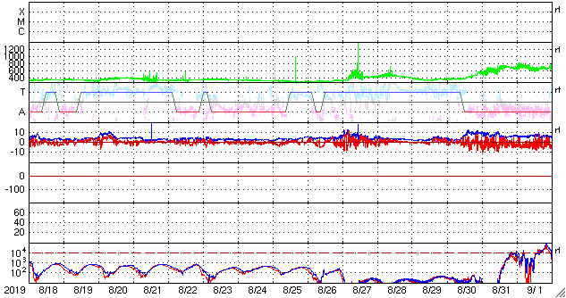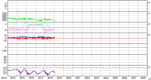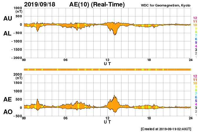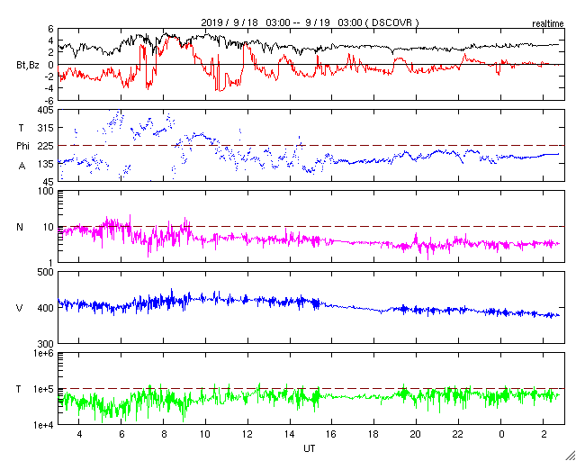 2019/ 9/19 11:58 更新 太陽風は平均的な速度が続いています。磁気圏は穏やかです。 担当 篠原 太陽風の速度は、今朝早くまで400km/秒を保っていましたが、 その後少し下がって、現在は380km/秒です。 今回はこのまま下がるでしょうか。 磁場強度は、3nTとやや弱い状態で推移しています。 南北成分は、グラフの前半は弱い南寄りになっていて、 AE指数に300nTや700nTの小中規模の変化を起こしています。 その後は、磁場は0nT付近で小さく変化する程度になり、 AE指数の変化も見られなくなっています。 SDO衛星AIA193では、東側(左側)の南半球寄りに 縦に細長いコロナホールが見えていますが、 前周期よりも広がりが小さくなっています。 この領域は、27日周期の図の前周期の 8月27日の太陽風の高まりに関係していると思われますが、 小さくなったことで、 太陽風への影響も弱くなるかもしれません。 変化は9月23日頃に始まりそうです。 太陽は無黒点です。 穏やかな状態が続いています。