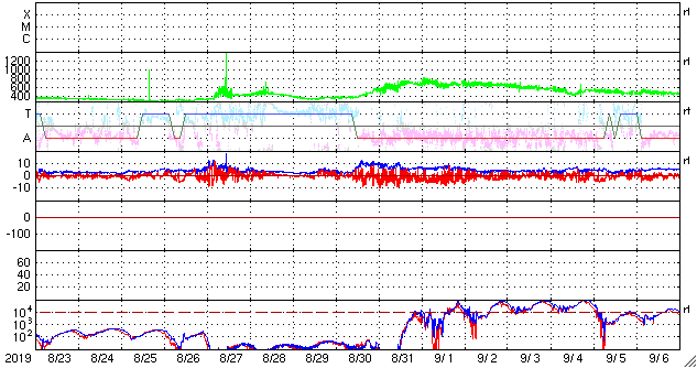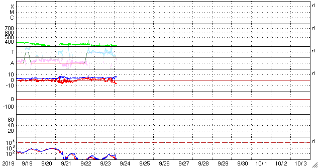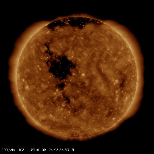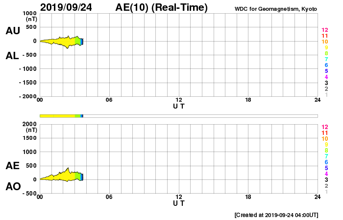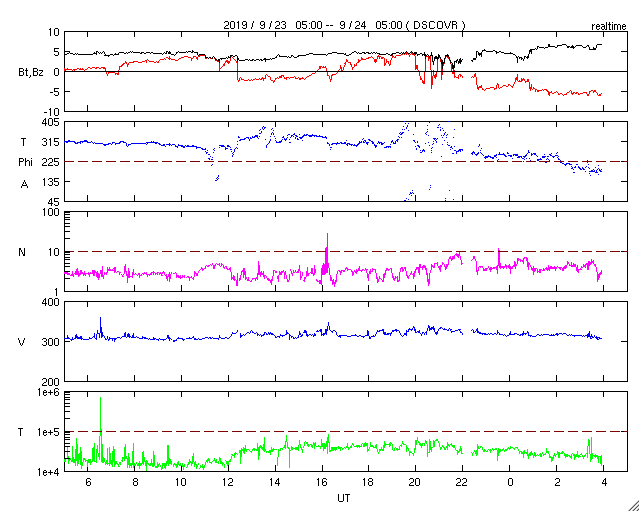 2019/ 9/24 13:06 更新 低速の太陽風が続いています。イエローナイフのオーロラをどうぞ。 担当 篠原 景山植光さんより、カナダ・イエローナイフで、 現地21日0時前(世界時21日6時前)に撮影された オーロラの写真をいただきました。 この日の太陽風は、速度は300km/秒と低速で、 磁場の南北成分は0nT付近だったので、オーロラは低調だったのですが、 この写真の少し前に速度が350km/秒に少し高まるとともに、 磁場の南北成分が、-5nT程度の南向きに変化しました。 このため、磁気圏が少し活発になって、 AE指数に300nTの小規模の変化が起こりました。 掲載の写真は、このタイミングで撮影されたものです。 磁気圏全体で考えると小規模だったかもしれませんが、 頭上で発生すれば見事なオーロラです。 ほぼ1分間隔の連続写真ですので、 オーロラが拡大する様子がよく分かります。 臨場感のある写真をどうもありがとうございます。 現在の太陽風は、速度は310km/秒と低速の状態が続いています。 磁場強度は、5〜6nTと平均的な値が続いています。 コロナホールの影響が始まるかもしれないと書いていましたが、 今のところ目立った変化はありません。 磁場の南北成分は、グラフの中盤までは比較的北寄りだったのですが、 後半になって南向きに振れるようになり、 現在は -5nTの状態が続いています。 AE指数は、全体としては変化が小さく穏やかですが、 最後に400nTの小規模の変化が起きています。 磁場の南向きが続いているので、 この後もある程度の活動が続くかもしれません。 速度が遅いので小中規模の活動に留まると思いますが、注目してください。 このまま低速の太陽風が続いた場合、 次の変化は、SDO衛星AIA193の 太陽の中央の東寄り(左側)に見えているコロナホールの影響です。 前周期は8月31日から変化が始まりました。 今回も同様であれば、3日後の27日くらいになりそうです。 太陽は、昨日見えていた小さい黒点は既に見えなくなっていて、 無黒点に戻っています。 特に活動はなく、穏やかです。