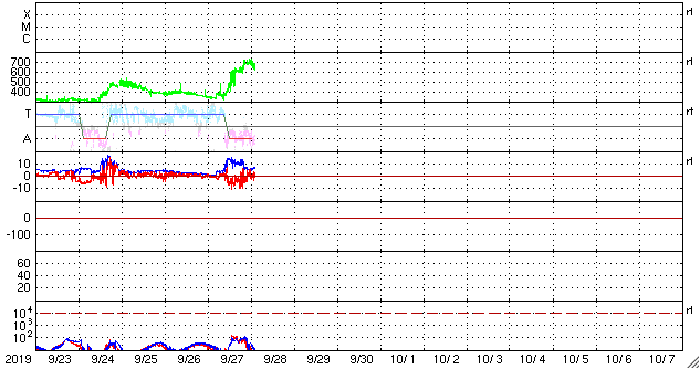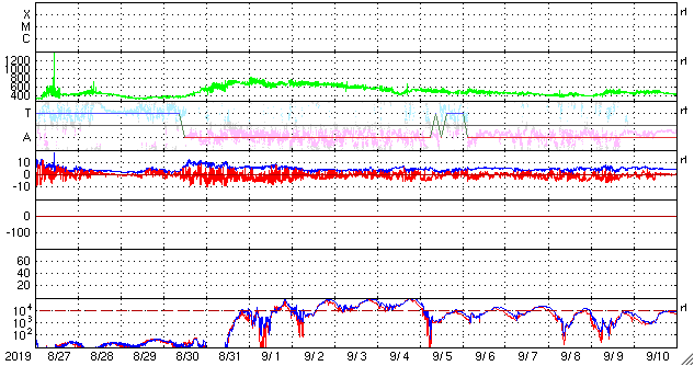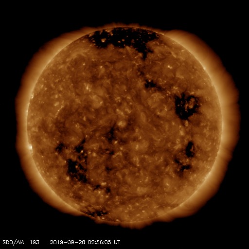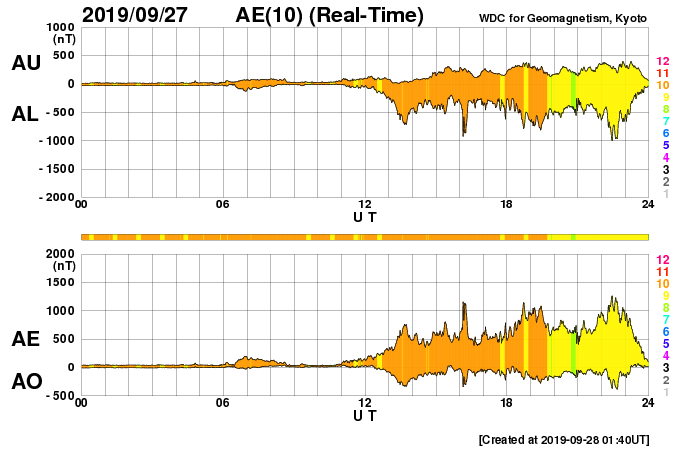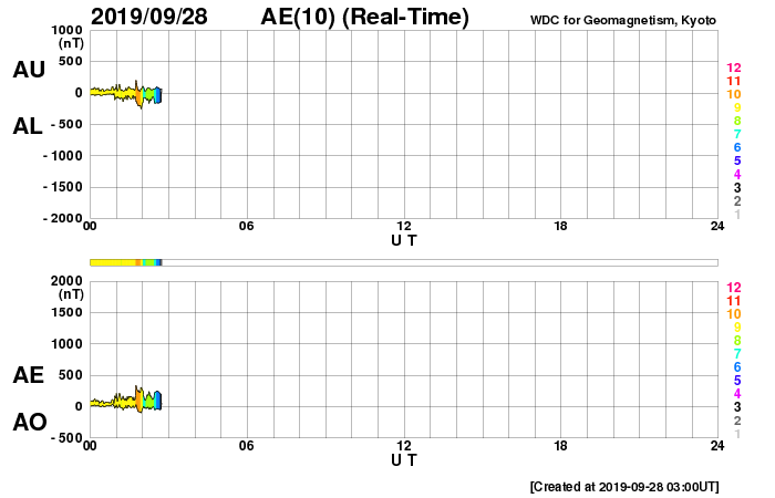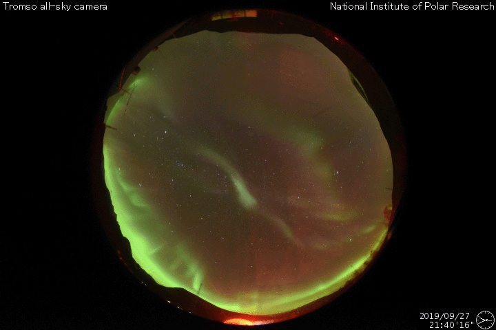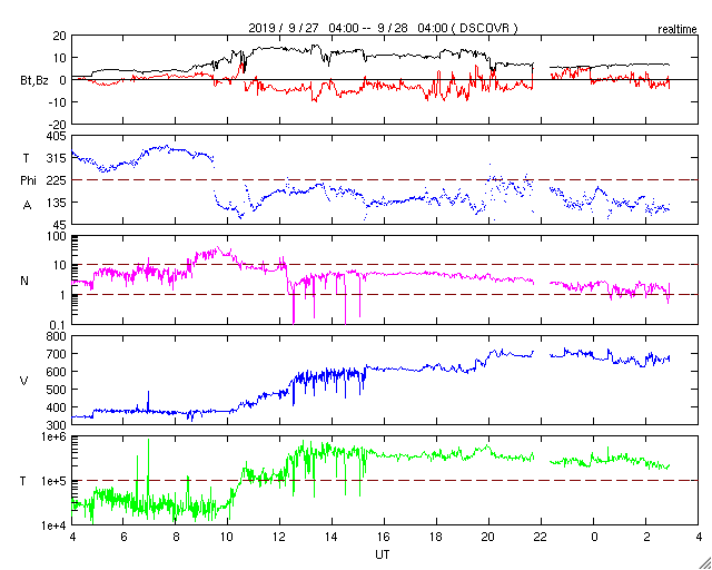 2019/ 9/28 12:02 更新 高速の太陽風が到来し、速度は650km/秒に高まっています。 担当 篠原 昨夜から、太陽風の速度が上昇を始め、 現在、650km/秒程度の高速太陽風になっています。 昨夕、27日18時(世界時27日9時)頃から、 太陽風の磁場強度が強まり始めました。 3〜4nTとやや弱い状態から次第に高まって、 27日20時(世界時27日11時)には、14nTに達しました。 この頃から速度も上昇を始め、380km/秒のやや低速の状態から、 今朝、28日5時(世界時27日20時)に、700km/秒まで高まっています。 磁場強度は、最高値に達した後はゆっくりと下がり、 現在は6nTと平均的な状態に戻っています。 速度は、最高値からは少し下がっていますが、 650km/秒前後と高い速度を保っています。 27日周期の図を見ると、 変化の始まりは、前周期よりも1日程度遅れています。 最高速度は、前回は750km/秒で、ほぼ同じくらいと言えるでしょう。 太陽風磁場の南北成分は、磁場が強まった頃から、 -5nT程度の南向きの変化が半日ほど続いています。 速度の高まりもあって磁気圏の活動は強まり、 AE指数は500〜1200nTと、中規模から大規模の変化が こちらも半日程度続いています。 最後の高まりに近い、世界時27日22時頃のオーロラの様子を、 北半球のノルウェー・トロムソの全天カメラで紹介します。 現在は南北成分は小さくなっていて、 AE指数の変化も小さくなっています。 前周期の太陽風は、 9月6日頃までは500km/秒を超える高速風が続き、 更に、その後も400〜500km/秒の状態が9月18日まで続きました。 今回はどう推移するでしょうか。 前回は、オーロラも活動的な状態が続きました。 こちらにも注目してください。 太陽では、SDO衛星AIA193の太陽コロナ写真で、 東端(左端)から明るい領域がこちら側に姿を現しました。 磁場の強まりも見えていますが、黒点は見えない様です。