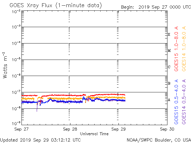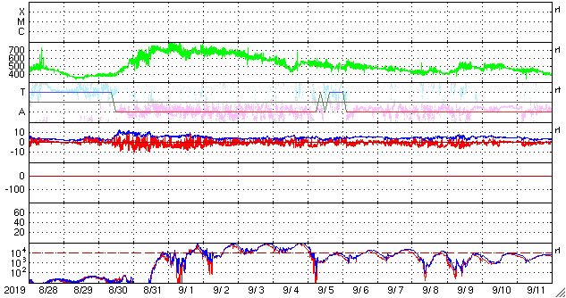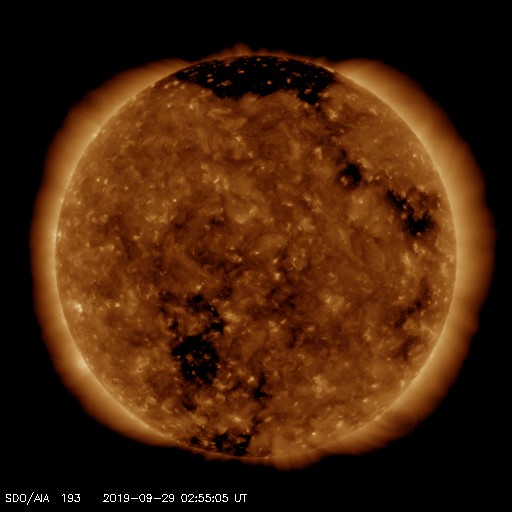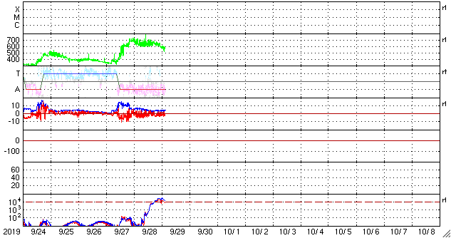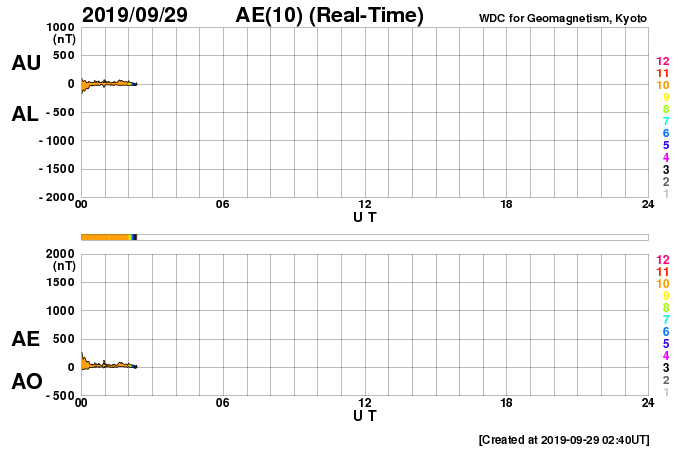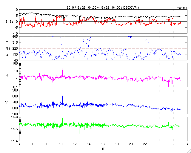 2019/ 9/29 12:16 更新 高速の太陽風が続き、磁気圏も活動的です。 担当 篠原 太陽風の速度は、今朝まで600km/秒台を保っていましたが、 その後少し下がって、570km/秒となっています。 高速の状態は続いています。 磁場強度も、6nTから4nTへ少し下がっています。 27日周期の図では、 前周期は8月31日から9月3日まで、 4日にわたって600km/秒台の高速風が続きました。 このまま速度が下がって行くと、 今回は1日半に縮んでしまうことになります。 太陽風磁場の南北成分は、 -2〜 -3nT程度の変化ですが、南寄りの傾向が続いています。 磁気圏は活動的な状態が続き、 AE指数は、500〜1200nTの変化が続いています。 SDO衛星AIA193では、 現在の高速風をもたらしているコロナホールは西の端に近付いていますが、 中央部の南半球側にもコロナホールが見えています。 前周期もこの様な状態で、この後、500km/秒前後の太陽風が長く続きました。 今回はどの様に推移するでしょうか。 太陽は、無黒点で穏やかな状態が続いています。 高速太陽風の影響を受けて、 放射線帯の高エネルギー電子が増加し、 GOES衛星のグラフ(青線、赤線)は、どちらも10,000を超えています。