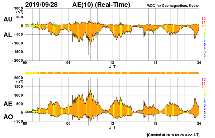 (c) SDO (NASA) ![]() SDO衛星による太陽の可視光写真 (c) SDO (NASA) ![]() DSCOVRが観測した太陽風の磁場(1番上の枠、黒線は全体の強度、赤線は南北成分) および、太陽風の密度(3番目の紫線)、速度(4番目の青線) (c) データ:NOAA/SWPC、作図:宇宙天気ニュース ![]() AE指数(速報値) 下段のAEグラフの値が高くなると、オーロラ活動が活発化しています。 (c) 京都大学WDC ![]() ![]() 27日の太陽周期に合わせたデータプロット 太陽が同じ面を地球に向けていた27日前の変化から、今後を予想することができます。 (c) 作図:宇宙天気ニュース