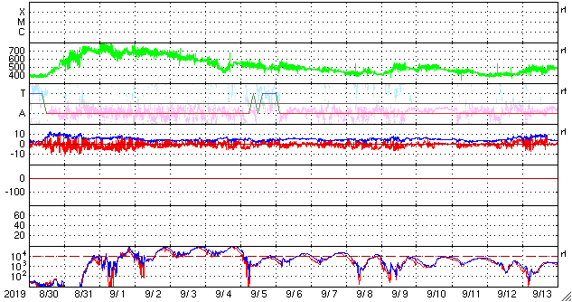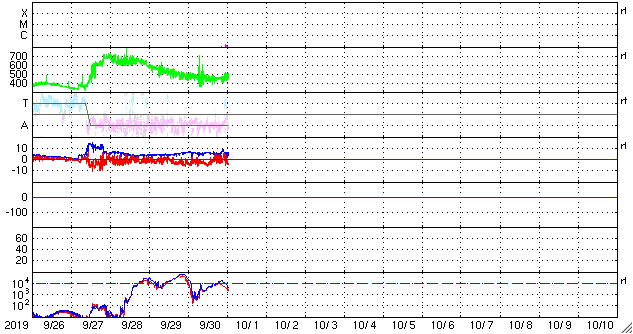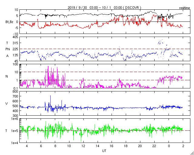 2019/10/ 1 11:04 更新 太陽の東端に黒点が現れています。太陽風はやや高速です。 担当 篠原 太陽の東端から黒点が姿を現しました。 端に近いためまだ見づらく、 掲載の可視光写真では、白斑の方が目立っています。 現れたのは、南緯10度と比較的低緯度です。 磁場の様子はまだはっきり分からないのですが、 現在の第24活動周期の黒点かもしれません。 X線グラフでも、 とても小さい値ですが、変化が現れています。 太陽風は、460km/秒とやや高速の状態が続いています。 磁場強度は、5〜6nTと平均的な値を保っています。 磁場の南北成分は、グラフの前半は南寄りの傾向が続いていて、 -3〜 -5nTの南向きが長い時間発生しています。 このため、磁気圏の活動も高まった状態が続いていて、 AE指数のグラフは、途中までは500nT前後の変化が連続しています。 太陽風のグラフの最後では、磁場は再び南向きになっています。 この傾向が続けば、この後も磁気圏の活動は続くでしょう。 SDO衛星AIA193では、 太陽の中央部の南半球側にコロナホールが見えています。 このままこの領域の影響に繋がって行きそうです。 放射線帯の高エネルギー電子は減少して、 GOES15(青線)だけ1万に達しています。 ![]() SDO衛星のAIA193カメラによる太陽コロナの様子 (c) SDO (NASA) ![]() SDO衛星による太陽の可視光写真。マウスの矢印を写真に重ねると、黒点番号付きの写真に切り替わります。 (c) SDO (NASA) ![]() GOES衛星の太陽X線データ (c) NOAA/SWPC ![]() DSCOVRが観測した太陽風の磁場(1番上の枠、黒線は全体の強度、赤線は南北成分) および、太陽風の密度(3番目の紫線)、速度(4番目の青線) (c) データ:NOAA/SWPC、作図:宇宙天気ニュース ![]() AE指数(速報値) 下段のAEグラフの値が高くなると、オーロラ活動が活発化しています。 (c) 京都大学WDC ![]() ![]() 27日の太陽周期に合わせたデータプロット 太陽が同じ面を地球に向けていた27日前の変化から、今後を予想することができます。 (c) 作図:宇宙天気ニュース