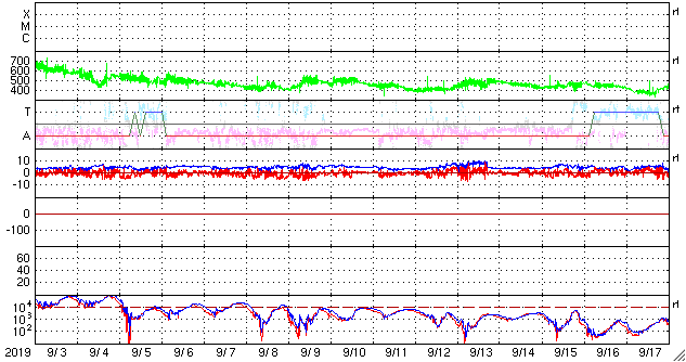 - 2019/ 9/30 12:54 太陽風の速度は少し下がってやや高速です。磁気圏の活動は高まっています。