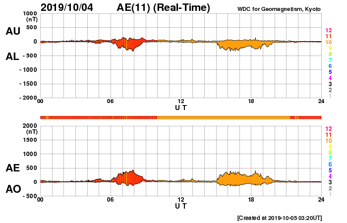 下段のAEグラフの値が高くなると、オーロラ活動が活発化しています。