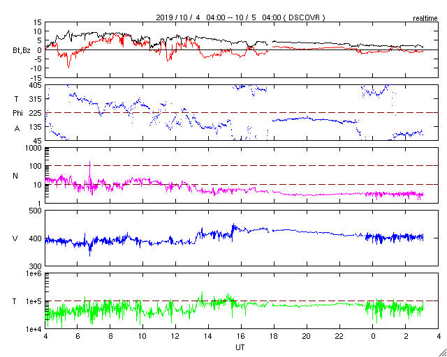 - 2019/10/ 4 12:36 太陽風は平均的な速度に戻っています。磁気圏も穏やかです。