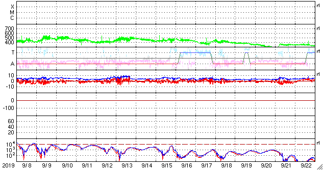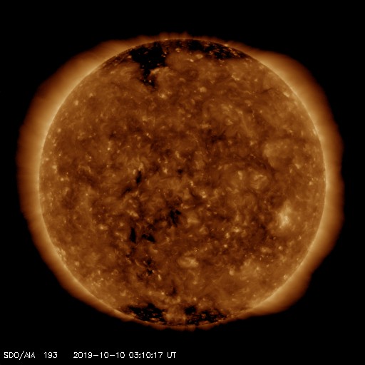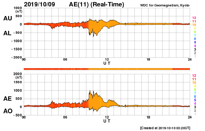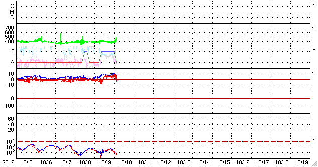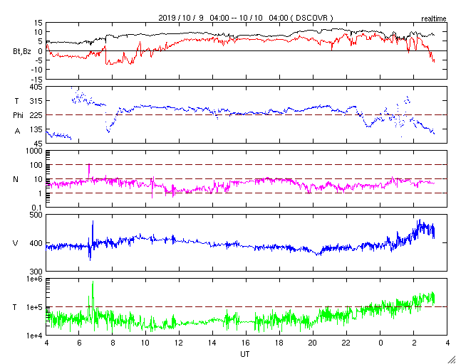 2019/10/10 12:21 更新 太陽風の速度は450km/秒に少し上がっています。磁気圏は穏やかです。 担当 篠原 太陽風は、昨日の午後から磁場強度が8nTに少し高まり、 現在にかけて7〜10nT程度で推移しています。 速度は、380〜400km/秒で安定していましたが、 今日の昼前から、450km/秒へ少し高まっています。 SDO衛星AIA193では、特にコロナホールは見られなかったので、 太陽風は、小さい変化に留まるでしょう。 磁場の南北成分は、 磁場の強まり始めに -7nTと南向きが強まりましたが、 その後は北向きに切り替わっています。 このため、AE指数は、1000nTに達する活動が1度発生した後は、 静かになっています。 27日周期の図の前周期を見ると、 太陽風はもう数日400km/秒台を保ちましたが、 その後は300km/秒台に下がって低速の風になっています。 今回も、基本的には穏やかな太陽風が続きそうです。 太陽は無黒点です。 X線グラフも変化はありません。