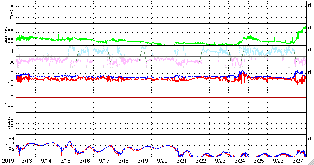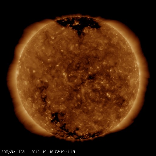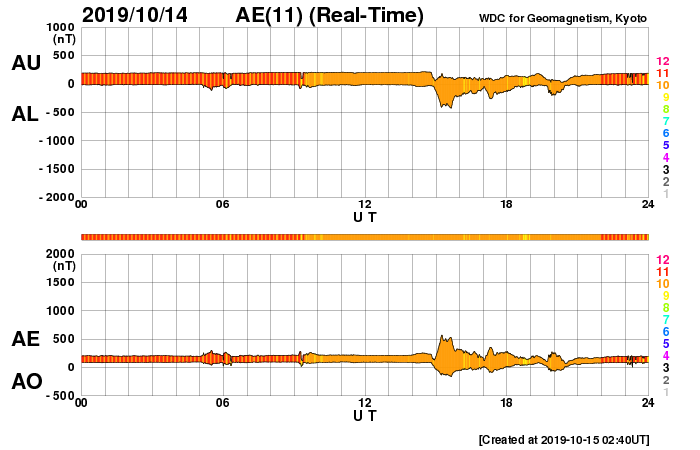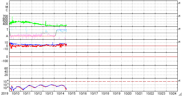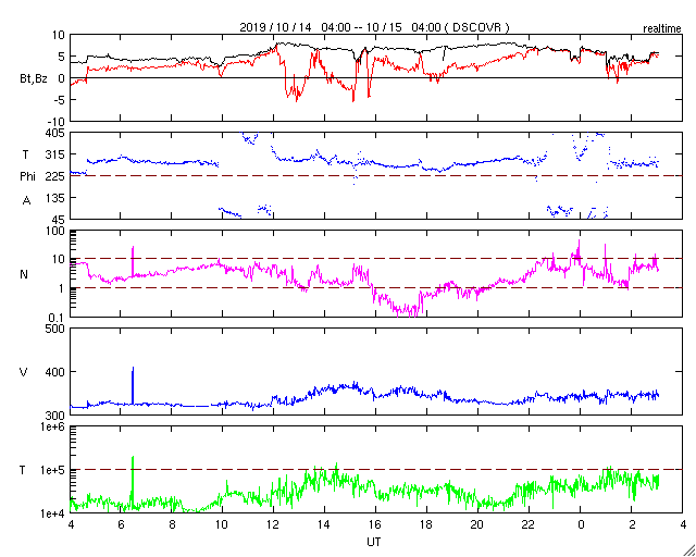 2019/10/15 12:19 更新 低速の太陽風が続いています。磁気圏も穏やかです。 担当 篠原 太陽風の速度は、320km/秒から350km/秒へ少し上がっていますが、 低速の状態が続いています。 磁場強度は、速度の変化とともに7nTくらいまで高まりましたが、 現在は4nTに戻っています。 太陽風は、全体としては穏やかに推移しています。 磁場の南北成分は、北寄りの傾向になっています。 一時的に南向きに変化した頃に、 AE指数に500nTの変化が発生していますが、 その他の時間帯は、磁気圏は穏やかです。 SDO衛星AIA193では、 太陽の南極域から、東側(左側)の低緯度にかけて、 ぼんやりとコロナホールの暗い筋が見えています。 この領域は、前周期は、 27日周期の図の9月24日に始まる太陽風の高まりと関係しています。 今回も同様であれば、10月21〜22日頃に始まりそうです。 太陽は無黒点です。 穏やかな状態が続いています。
