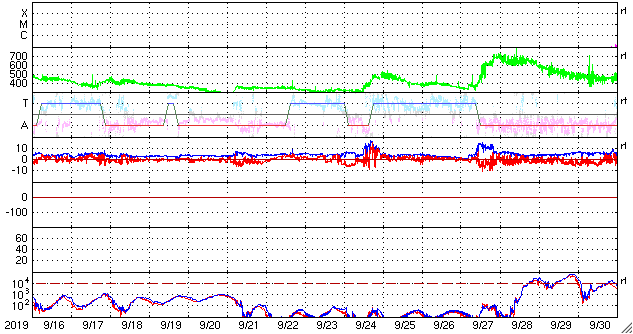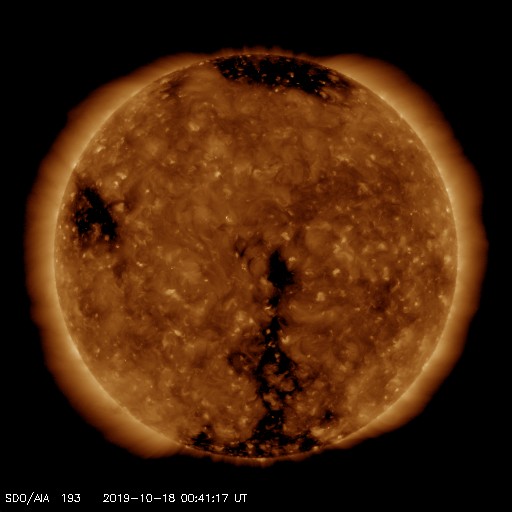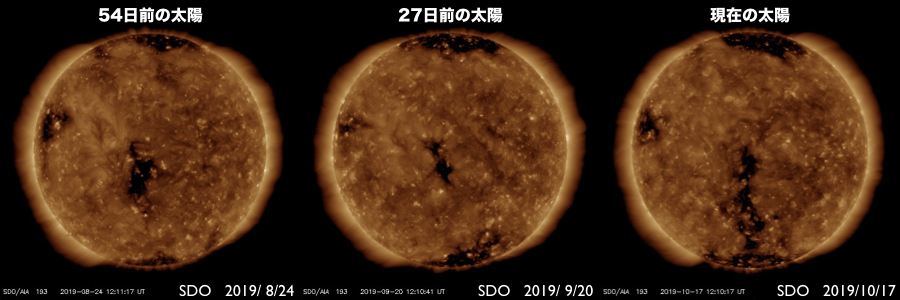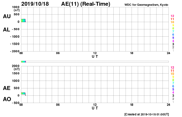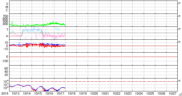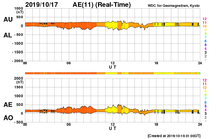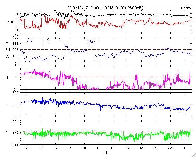 2019/10/18 09:55 更新 太陽風の速度は下がって低速です。磁気圏も概ね静穏です。 担当 篠原 太陽風の速度は360km/秒へ下がり、再び低速の風になっています。 磁場強度も3nTとやや弱い状態です。 磁場の南北成分は、弱い南寄りになっています。 磁気圏は基本的には穏やかですが、 AE指数には小さい変化も起きています。 SDO衛星AIA193では、 太陽の中央部の南半球側にコロナホールが見えています。 この領域の広がりを、以前の周期と1枚目の図で比較します。 すると、低緯度域の大きさはあまり変わっていませんが、 中緯度から南極域にかけて、縦に広がりが増しています。 27日周期の図を見ると、 前の周期では(9月24日以降)、太陽風は500km/秒に高まりました。 コロナホールの広がりの変化で太陽風の様子がどの様に変わるのか、 3日後以降の太陽風の推移に注目してください。 太陽は無黒点が続いています。 X線グラフも変化はありません。