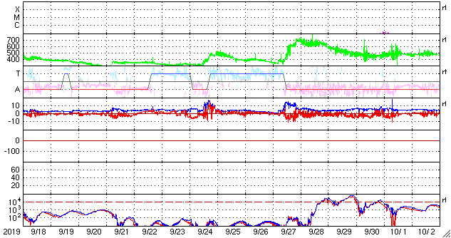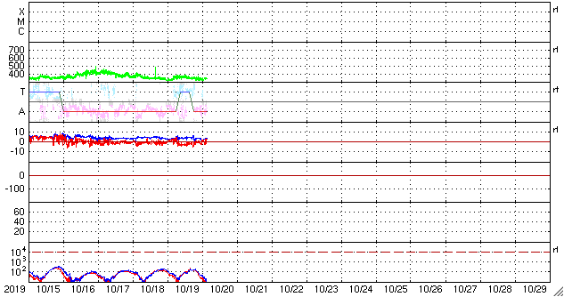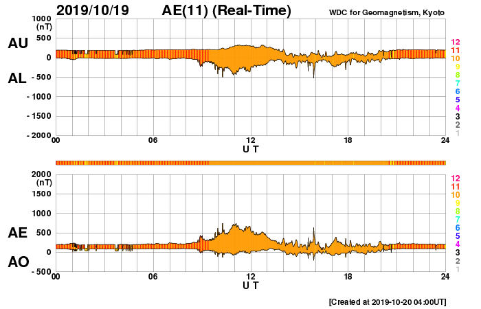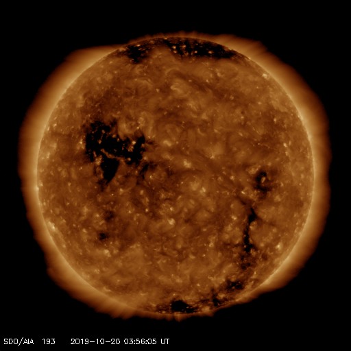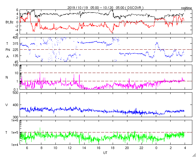 2019/10/20 13:02 更新 低速の太陽風が続いています。太陽は無黒点が続いています。 担当 篠原 太陽風の速度は、300km/秒台の中で上下していますが、 グラフの最後は350km/秒になっています。 磁場強度は、3〜4nTとやや弱い状態です。 太陽風は、穏やかな状態が続いています。 太陽風磁場の南北成分は、 グラフの中盤で弱い南寄りが続いています。 このため、磁気圏でも変化がやや強まって、 AE指数は、500〜700nTの変化が発生しています。 その後は磁場の南向きの変化が小さくなり、 磁気圏は静かになっています。 SDO衛星AIA193では、 コロナホールが西側(右側)と東側(左側)にそれぞれ見えています。 西のコロナホールの影響が、 明日くらいから始まるかもしれません。 前周期は、太陽風の速度は500km/秒くらいまで高まりました。 今回はどうなるでしょうか。 太陽は、無黒点で穏やかです。
