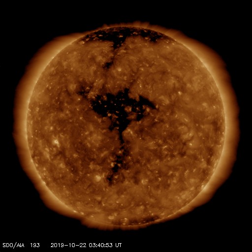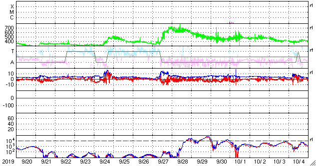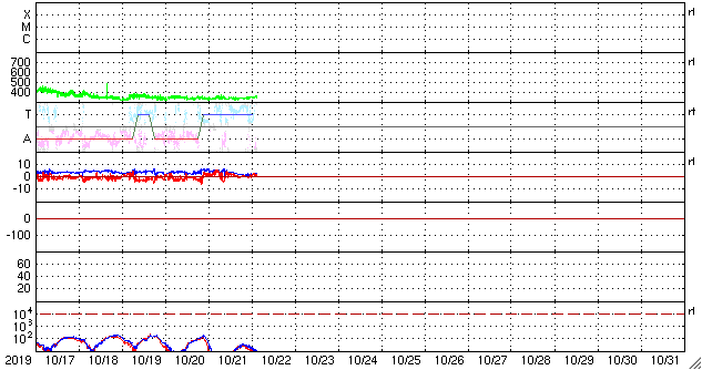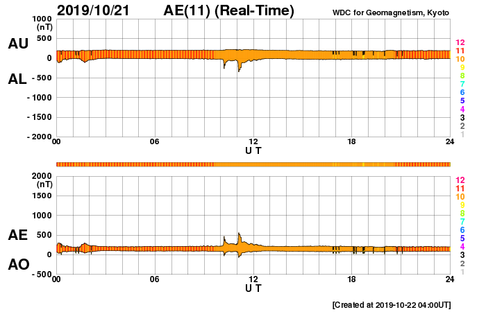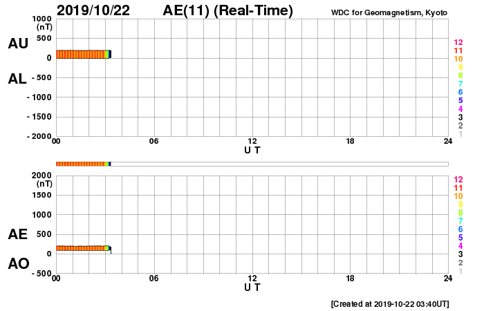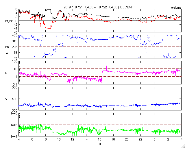 2019/10/22 12:53 更新 太陽風は低速の状態が続いています。 担当 篠原 太陽風の速度は、350km/秒で推移するようになっていますが、 低速の状態は続いています。 磁場強度も3nTとやや弱い状態です。 磁気圏も穏やかで、AE指数は特に変化のない状態です。 27日周期の図を見ると、 前周期の太陽風速度の高まりのタイミングから半日ほど過ぎています。 変化の到来が前後することは普通に起こることなので、 引き続き太陽風の変化に注目して下さい。 また、現在のSDO衛星AIA193の写真では、 太陽の中央部に大きくコロナホールが広がっています。 24〜25日くらいから、こちらの影響も始まりそうです。 太陽は、東側の中央部にとても小さい黒点が現れています。 SDO衛星AIA193の写真で、小さく光っている領域です。 群番号が付けられるような黒点になるでしょうか。 ![]() SDO衛星のAIA193カメラによる太陽コロナの様子 (c) SDO (NASA) ![]() SDO衛星による太陽の可視光写真。マウスの矢印を写真に重ねると、黒点番号付きの写真に切り替わります。 (c) SDO (NASA) ![]() DSCOVRが観測した太陽風の磁場(1番上の枠、黒線は全体の強度、赤線は南北成分) および、太陽風の密度(3番目の紫線)、速度(4番目の青線) (c) データ:NOAA/SWPC、作図:宇宙天気ニュース ![]() AE指数(速報値) 下段のAEグラフの値が高くなると、オーロラ活動が活発化しています。 (c) 京都大学WDC ![]() ![]() 27日の太陽周期に合わせたデータプロット 太陽が同じ面を地球に向けていた27日前の変化から、今後を予想することができます。 (c) 作図:宇宙天気ニュース