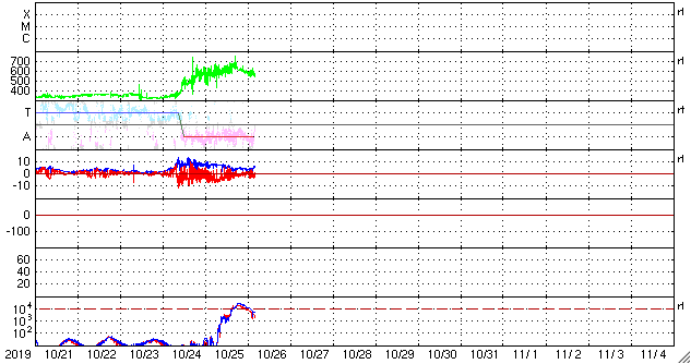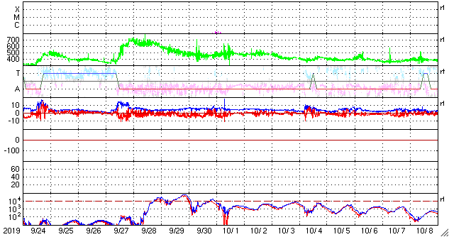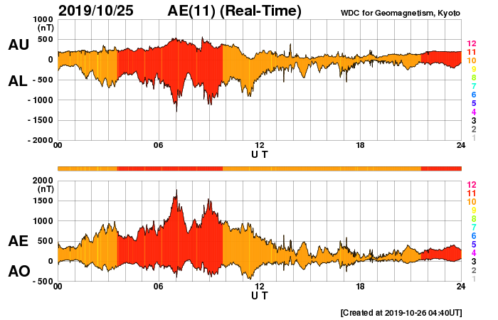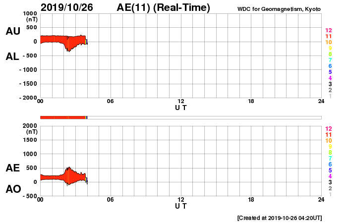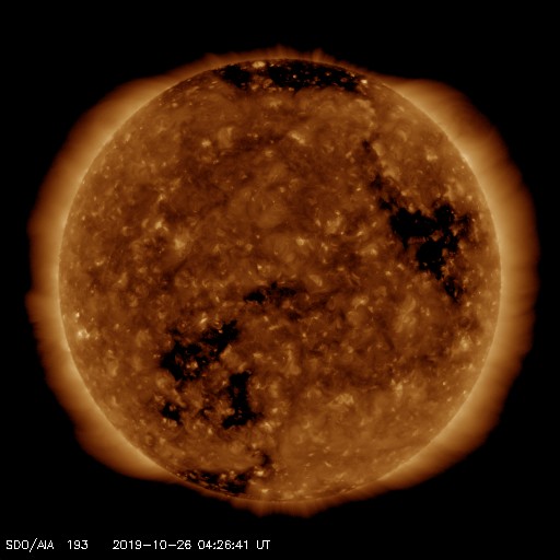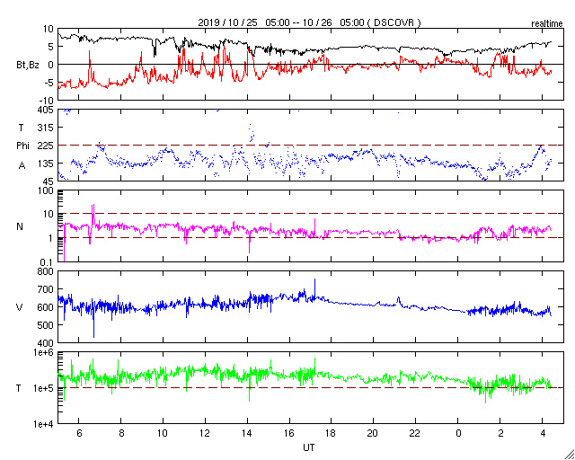 2019/10/26 13:39 更新 高速太陽風が続き、磁気圏の活動強まっています。 担当 篠原 太陽風の速度は、今朝くらいまで600lkm/秒台を保ち、 その後ゆっくりと下がり始めて、現在は570km/秒です。 磁場強度は、多少増減しながらですが、 5nT付近を推移しています。 高速太陽風は高まった状態が続いています。 27日周期の図を見ると、 前周期の高速風は、この辺りから速度が一段下がっています。 今回も、同様に速度が下がろうとしているのかもしれません。 磁場の南北成分は、 グラフの前半で -5nT程度の南向きの変化が続き、 この頃に、AE指数は1000nTから1500nTを超える 大きな変化を記録しています。 その後、磁場は0nT付近で小さく変化する様になり、 AE指数の変化も小さくなっています。 太陽風のグラフの最後では、 磁場は小幅ですが南向きに変化する様になっています。 この状態が続けば、磁気圏の活動も、 前半ほどではありませんが再び高まりそうです。 SDO衛星AIA193では、 今回の高速太陽風をもたらしたコロナホールが、 太陽の西の端に近付いています。 一方、南東側(左下)には、 緯度が高めですがコロナホールが広がっています。 前周期は、この領域の影響は特に見られなかったのですが、 今回はどうなるでしょうか。 太陽は無黒点で、穏やかに推移しています。 高速太陽風の影響を受けて、 放射線帯の高エネルギー電子が増加し、1万の線を越えています。 この後、更に高まるかもしれません。 ![]() SDO衛星のAIA193カメラによる太陽コロナの様子 (c) SDO (NASA) ![]() SDO衛星による太陽の可視光写真 (c) SDO (NASA) ![]() DSCOVRが観測した太陽風の磁場(1番上の枠、黒線は全体の強度、赤線は南北成分) および、太陽風の密度(3番目の紫線)、速度(4番目の青線) (c) データ:NOAA/SWPC、作図:宇宙天気ニュース ![]() AE指数(速報値) 下段のAEグラフの値が高くなると、オーロラ活動が活発化しています。 (c) 京都大学WDC ![]() ![]() 27日の太陽周期に合わせたデータプロット 太陽が同じ面を地球に向けていた27日前の変化から、今後を予想することができます。 (c) 作図:宇宙天気ニュース
