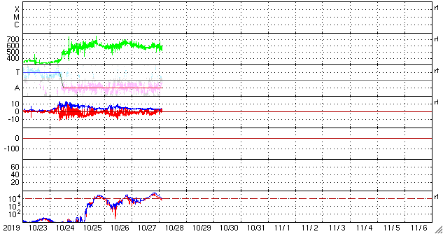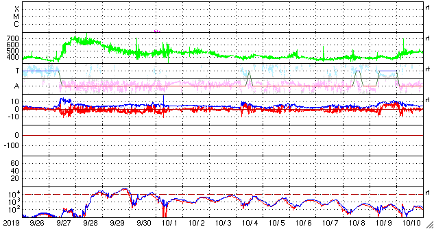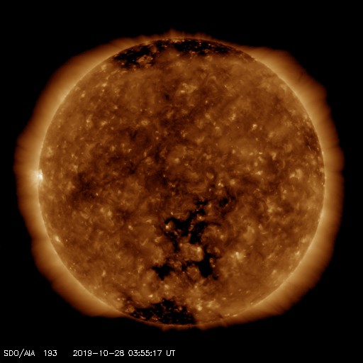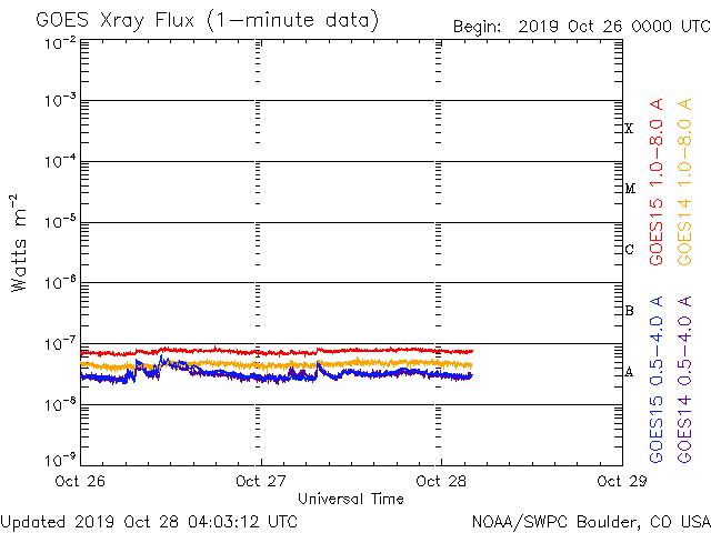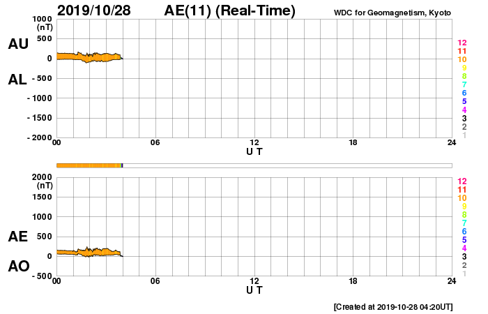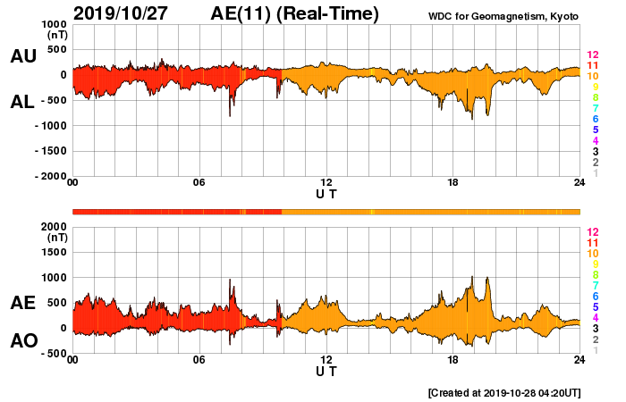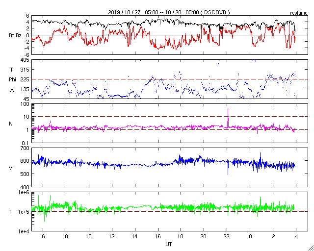 2019/10/28 13:10 更新 600km/秒付近の高速太陽風が続き、磁気圏も活動的です。 担当 篠原 太陽風は、570〜600km/秒を上下しながら高速の風が続いています。 グラフの最後は低下に向かっている様な印象です。 磁場強度は3〜4nTとやや弱くなっています。 磁場の南北成分は、振れ幅は小さいですが南寄りに変化しています。 磁気圏は活動的な状態が続いていて、 AE指数は、500〜1000nTの中規模の変化が続いています。 27日周期の図を見ると、 前周期はもう2日ほど高速の太陽風が続き、 その後平均的な速さに下がりました。 SDO衛星AIA193の太陽コロナ写真では、 今回の高速風をもたらしたコロナホールは太陽の西の端に去っていて、 影響は弱まっていきますが、 次のコロナホールも太陽の中央部の南半球側に見えています。 この領域は、前回は太陽風速度が高まる変化は見られなかったのですが、 今回はどうなるでしょうか。 引き続き注目してください。 太陽は、昨日注目していた東端の領域がこちら側に回ってきました。 磁場の強まりと、可視光写真では白斑が見えていますが、 黒点があるかどうかはよく分かりません。 あったとしても、小さい黒点になりそうです。 X線グラフも特に変化は見られません。 放射線帯の高エネルギー電子は、 5万程度まで高まっています。