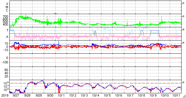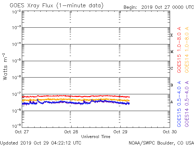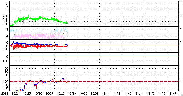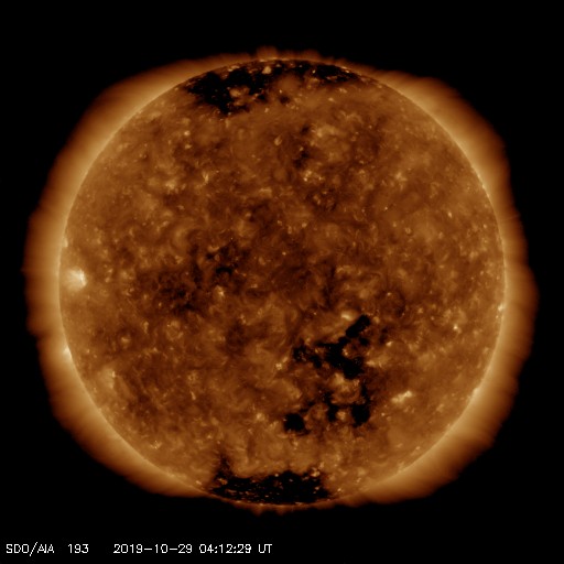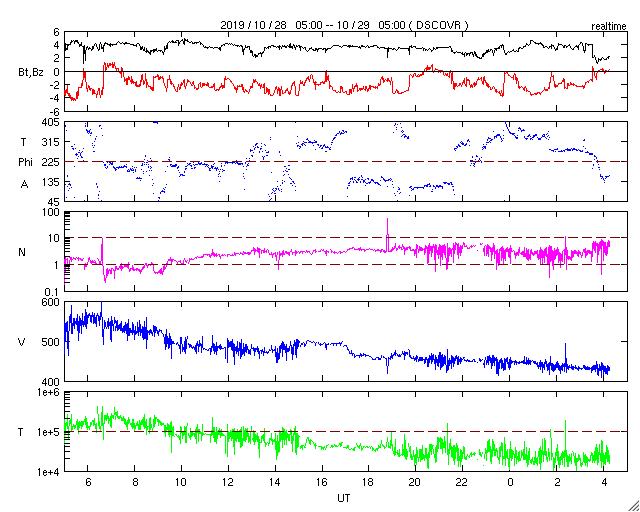 2019/10/29 13:27 更新 高速太陽風は終わり、太陽風の速度は430km/秒に下がっています。 担当 篠原 太陽風の速度は昨日のニュース以降もゆっくりと低下し、 夜遅くに500km/秒台を割って、 現在は430km/秒と平均的な速さに戻っています。 磁場強度は、3〜4nTとやや弱い状態が続いています。 磁場の南北成分は、 -2〜 -3nT程度の弱い南向きが続いています。 AE指数は、300〜500nTの小規模の変化が連続的に発生しています。 高速の状態が終わったので、 磁場の南向きの変化が今後も続いても、 磁気圏の変化は、より小さい規模になりそうです。 27日周期の図を見ると、 前周期よりも1日半ほど早く高速風が終わっています。 この後、400km/秒前後の状態が続くのか、 SDO衛星AIA193の太陽の南半球側に見えているコロナホールの影響で 速度が再び高まるのか、注目してください。 太陽は、無黒点です。 SDO衛星AIA193の東端(左端)の明るい領域にも、 黒点は見えていません。 放射線帯の高エネルギー電子は、高まった状態が続いています。 高速太陽風が終わったので、 今後はゆっくりと減少していくでしょう。