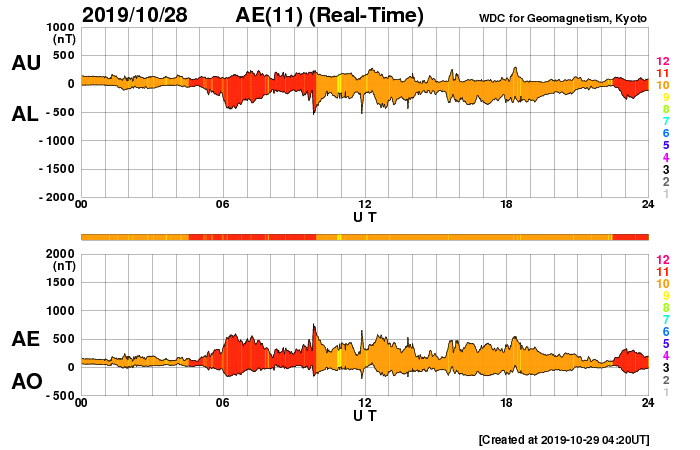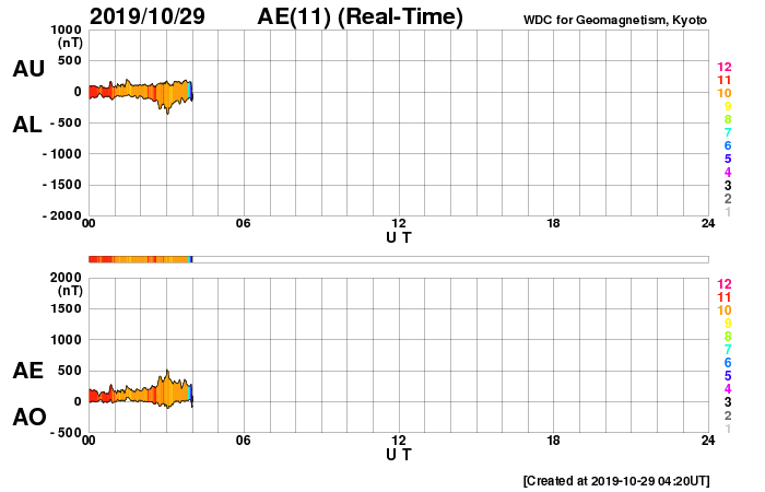 (c) SDO (NASA) ![]() SDO衛星による太陽の可視光写真 (c) SDO (NASA) ![]() DSCOVRが観測した太陽風の磁場(1番上の枠、黒線は全体の強度、赤線は南北成分) および、太陽風の密度(3番目の紫線)、速度(4番目の青線) (c) データ:NOAA/SWPC、作図:宇宙天気ニュース ![]() AE指数(速報値) 下段のAEグラフの値が高くなると、オーロラ活動が活発化しています。 (c) 京都大学WDC ![]() ![]() 27日の太陽周期に合わせたデータプロット 太陽が同じ面を地球に向けていた27日前の変化から、今後を予想することができます。 (c) 作図:宇宙天気ニュース
