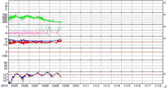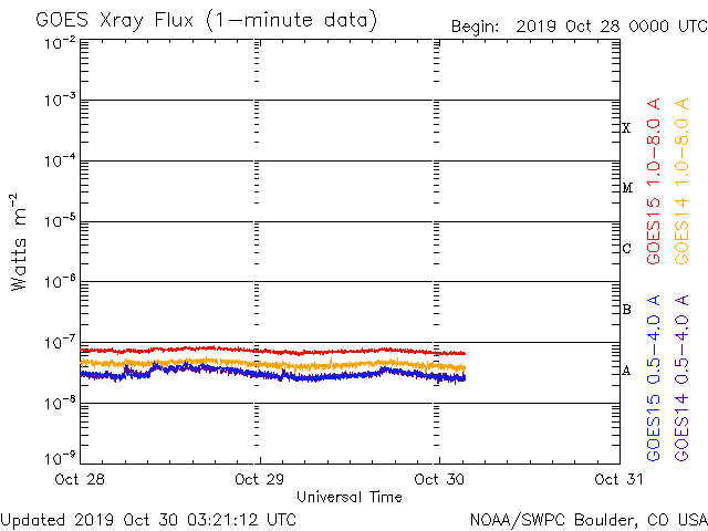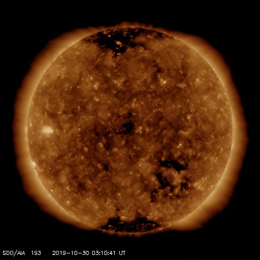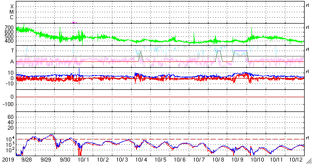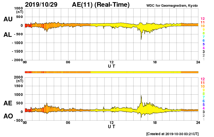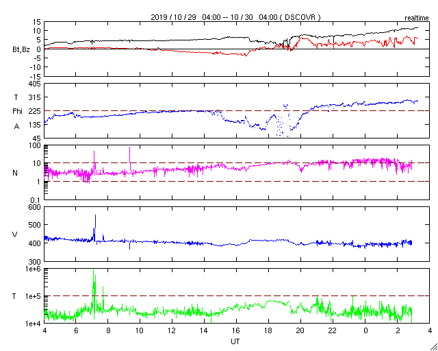 2019/10/30 12:22 更新 太陽風は平均的な速度で安定しています。 担当 篠原 太陽風の速度は400km/秒まで下がったところで止まり、 以降、この状態が続いています。 磁場強度は、昨日のニュース以降、 5nTと平均的な値が続いていましたが、 今朝早くから強まり始めて、現在は10nTに達しています。 今のところ、磁場の強まりに伴う速度の変化は起きていません。 磁場の強まりだけで終わるのか、速度の高まりが続くのか、 しばらく注目してください。 太陽風磁場の南北成分は、 太陽風のグラフの中盤で南向きに変化して、 後半は北寄りになっています。 磁気圏の活動も、 AE指数で500〜900nTの中規模の変化が起きていますが、 その後は静かになっています。 SDO衛星AIA193では、 南半球のコロナホールが西側に進んでいます。 この領域の影響で速度が高まるのか、注目してください。 太陽は、無黒点で穏やかな状態が続いています。 放射線帯の高エネルギー電子は、高まった状態が続いていますが、 昨日より少し減少しています。