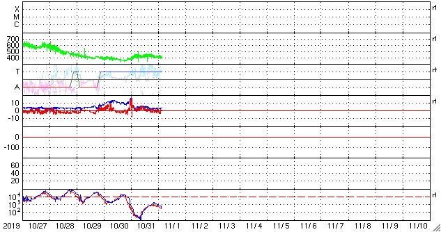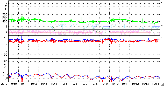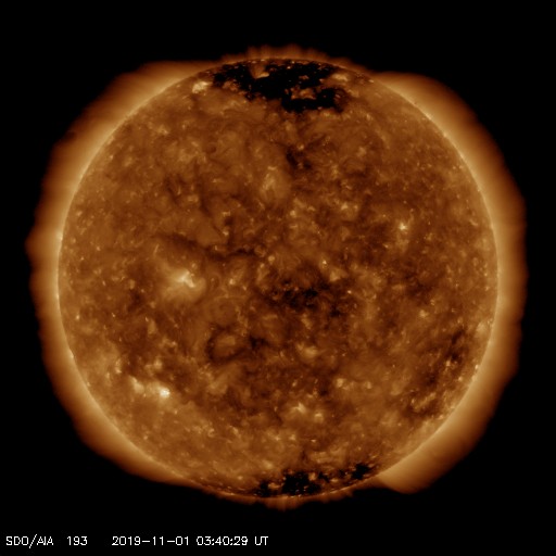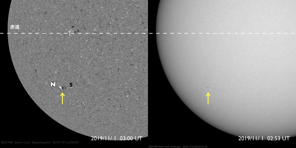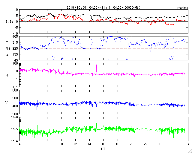 2019/11/ 1 12:49 更新 太陽の南半球に第25期の黒点が現れています。太陽風は平均的な状態です。 担当 篠原 太陽の南東(左下)に黒点が発生しています。 磁場の並びは新しい第25活動周期の順番で、 出現緯度も南緯28度程度と高く、 新しい周期の黒点と考えられます。 太陽風の速度は、今朝まで440km/秒付近の状態が続き、 その後、400km/秒へ少し下がっています。 磁場強度は、3〜5nT程度で推移しています。 太陽風は、平均的な状態が続いています。 磁場の南北成分は、グラフの前半は北寄りで推移し、 後半は時々小さく南に変化する程度です。 磁気圏は穏やかで、AE指数は特に変化のない状態です。 27日周期の図を見ると、前周期の太陽風は、 この後しばらく400km/秒付近の速度が続いています。 今回も同様の推移になるのでしょうか。 放射線帯の高エネルギー電子は、 1万を割って、1000くらいまで減少しています。 ![]() 太陽の南半球に現れた、新しい第25活動周期の磁場の並びを持つ黒点。SDO衛星。 (c) SDO (NASA)、作図:宇宙天気ニュース ![]() SDO衛星のAIA193カメラによる太陽コロナの様子 (c) SDO (NASA) ![]() SDO衛星による太陽の可視光写真。マウスの矢印を写真に重ねると、黒点番号付きの写真に切り替わります。 (c) SDO (NASA) ![]() GOES衛星の太陽X線データ (c) NOAA/SWPC ![]() DSCOVRが観測した太陽風の磁場(1番上の枠、黒線は全体の強度、赤線は南北成分) および、太陽風の密度(3番目の紫線)、速度(4番目の青線) (c) データ:NOAA/SWPC、作図:宇宙天気ニュース ![]() AE指数(速報値) 下段のAEグラフの値が高くなると、オーロラ活動が活発化しています。 (c) 京都大学WDC ![]() ![]() 27日の太陽周期に合わせたデータプロット 太陽が同じ面を地球に向けていた27日前の変化から、今後を予想することができます。 (c) 作図:宇宙天気ニュース