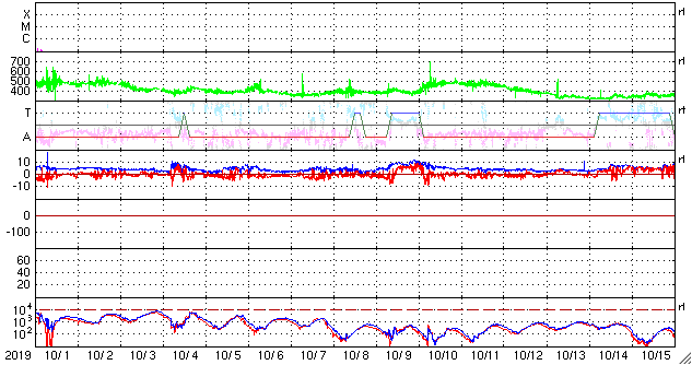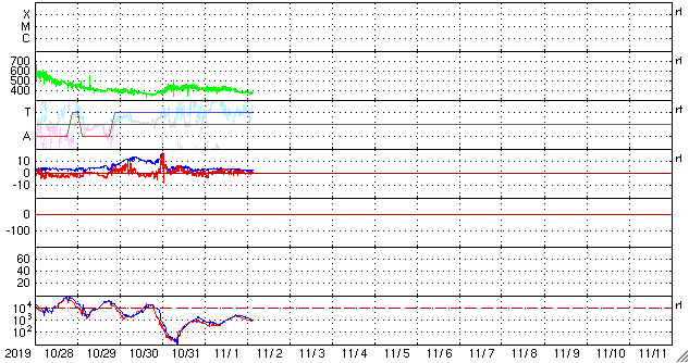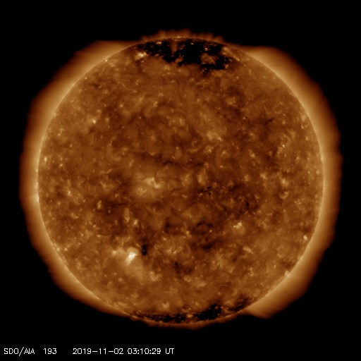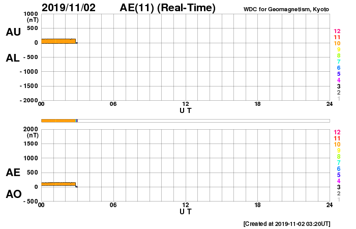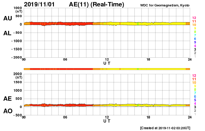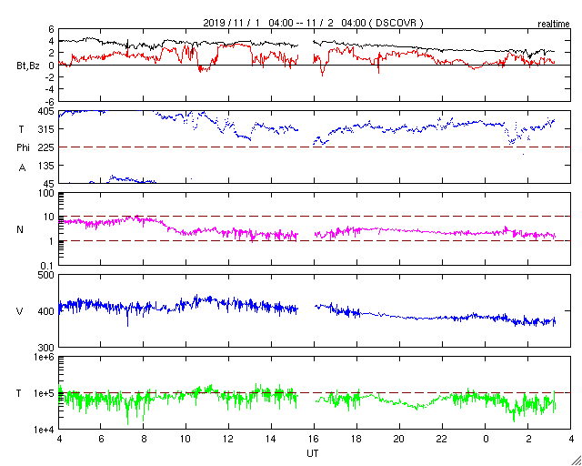 2019/11/ 2 12:25 更新 南半球に黒点が見えています。太陽風はやや低速になっています。 担当 篠原 昨日、太陽の南東(左下)に現れた黒点は、 2750群と番号が付けられました。 番号が付けられたのは、1か月ぶりです。 黒点は現在も見えていますが、可視光写真を調べると、 昨日の午後くらいに一番大きくなり、その後小さくなっています。 この後どうなるでしょうか。 太陽風は370km/秒へ速度が下がり、やや低速になっています。 磁場強度も、2〜3nTと弱くなっています。 SDO衛星AIA193ではコロナホールは特に見られず、 太陽風は穏やかに推移しそうです。 磁場の南北成分は、弱い北寄りで推移しています。 磁気圏は静穏で、AE指数はほとんど変化のない状態です。