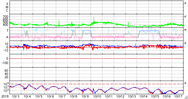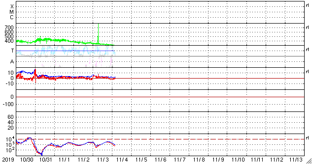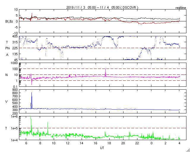 - 2019/10/31 12:03 太陽風は平均的な速さです。磁場の強まりは終わっています。