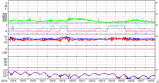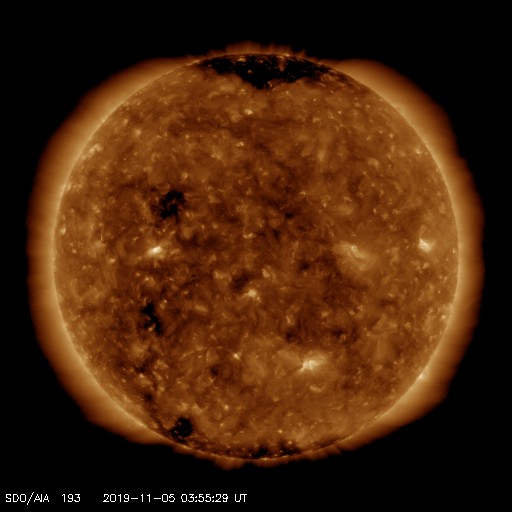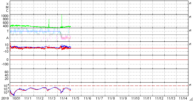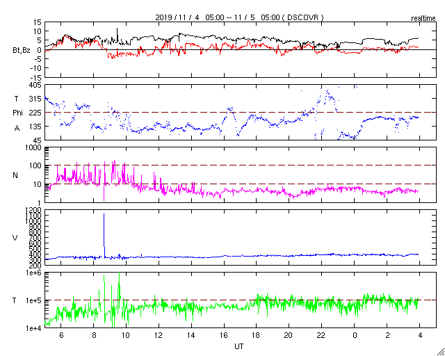 2019/11/ 5 13:10 更新 太陽に小さい黒点が現れています。太陽風は平均的な状態に戻っています。 担当 篠原 昨日の午後に、太陽の東側の赤道付近に黒点が発生しました。 夜には、2個見えるくらいになりましたが。 その後小さくなって、現在は可視光の拡大写真で1個が見える程度です。 SDO衛星AIA193のコロナ写真で、明るく光っている箇所です。 その他に黒点はなく、太陽は穏やかです。 太陽風は、昨日の午後に340km/秒に速度が少し高まり、 その後もゆっくりと上昇して、 現在は390km/秒と平均的な速さに戻っています。 磁場強度も速度と同様に5nT程度に高まっています。 現在もAE指数を参照することができませんが、 磁気圏は穏やかな状態が続いています。 太陽風磁場が弱い南向きになった頃に、 小規模の活動が起きている様です。 ![]() SDO衛星のAIA193カメラによる太陽コロナの様子 (c) SDO (NASA) ![]() SDO衛星による太陽の可視光写真。マウスの矢印を写真に重ねると、黒点番号付きの写真に切り替わります。 (c) SDO (NASA) ![]() GOES衛星の太陽X線データ (c) NOAA/SWPC ![]() DSCOVRが観測した太陽風の磁場(1番上の枠、黒線は全体の強度、赤線は南北成分) および、太陽風の密度(3番目の紫線)、速度(4番目の青線) (c) データ:NOAA/SWPC、作図:宇宙天気ニュース ![]() 27日の太陽周期に合わせたデータプロット 太陽が同じ面を地球に向けていた27日前の変化から、今後を予想することができます。 (c) 作図:宇宙天気ニュース