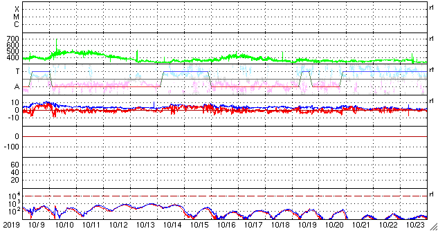 - 2019/11/ 6 12:22 太陽風は平均的な状態です。10月の黒点数は 0.4 でした。