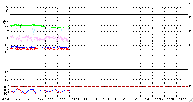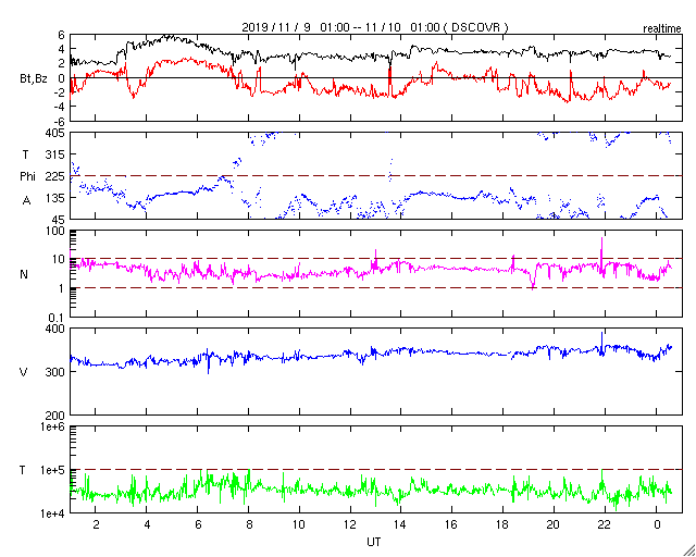 - 2019/11/ 9 10:29 低速の太陽風が続いています。磁気圏も穏やかです。