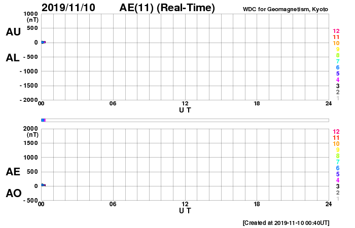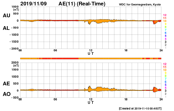 下段のAEグラフの値が高くなると、オーロラ活動が活発化しています。