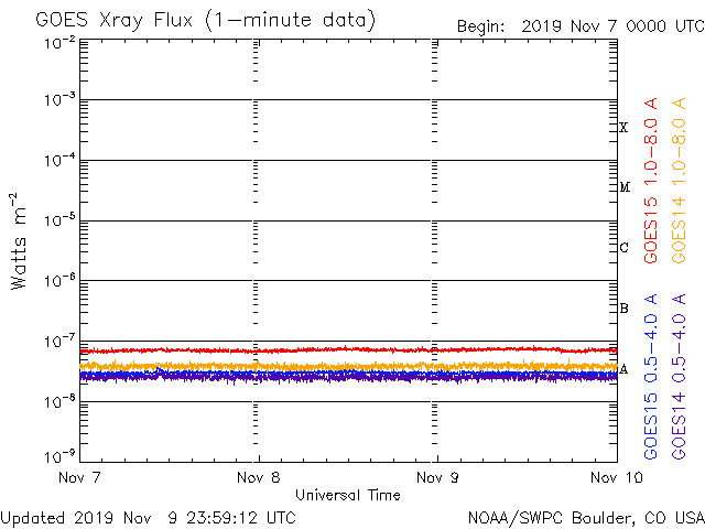 - 2019/11/ 7 12:19 太陽風は平均的な状態です。太陽は無黒点です。