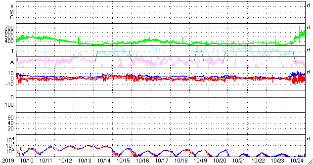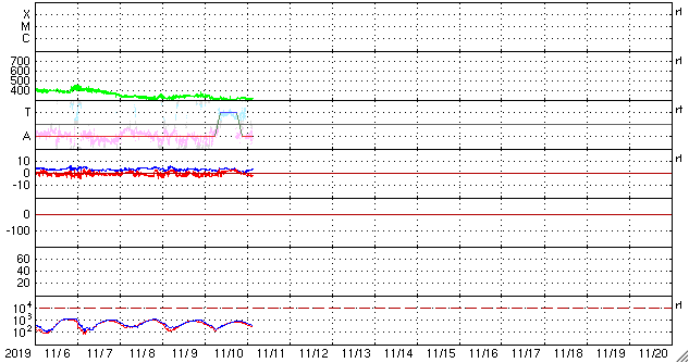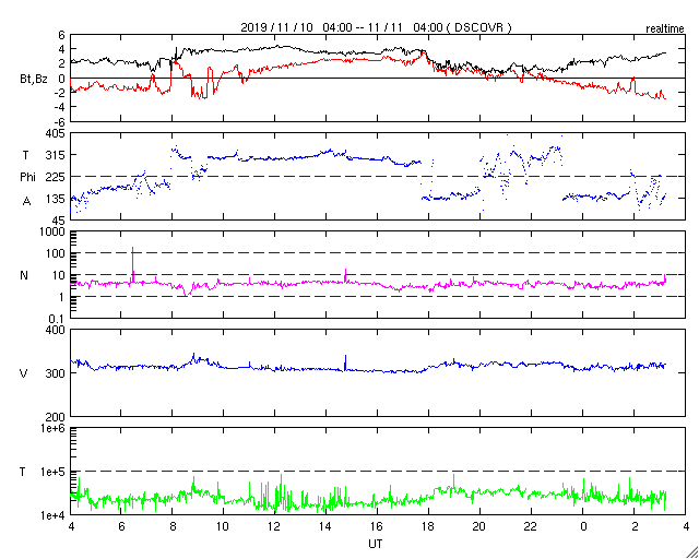 2019/11/11 12:24 更新 太陽風は300km/秒に下がっています。無黒点が続いています。 担当 篠原 太陽風の速度は、昨日のニュースの後に300km/秒へ下がり、 以降、300〜320km/秒で推移しています。 低速の風が続いています。 太陽風の磁場強度も、 1〜4nTの間で変化していて、弱い状態です。 磁気圏も静穏で、 AE指数はほとんど変化が見られません。 SDO衛星AIA193では、 太陽の南東側(左下)に縦に伸びるコロナホールが見えています。 この領域は、前周期は太陽風への影響が見られなかったのですが、 今回はどうなるでしょうか。 影響がやって来るとすると、5日後の16日頃になりそうです。 太陽は無黒点です。 穏やかな状態が続いています。 ![]() SDO衛星のAIA193カメラによる太陽コロナの様子 (c) SDO (NASA) ![]() SDO衛星による太陽の可視光写真 (c) SDO (NASA) ![]() DSCOVRが観測した太陽風の磁場(1番上の枠、黒線は全体の強度、赤線は南北成分) および、太陽風の密度(3番目の紫線)、速度(4番目の青線) (c) データ:NOAA/SWPC、作図:宇宙天気ニュース ![]() AE指数(速報値) 下段のAEグラフの値が高くなると、オーロラ活動が活発化しています。 (c) 京都大学WDC ![]() ![]() 27日の太陽周期に合わせたデータプロット 太陽が同じ面を地球に向けていた27日前の変化から、今後を予想することができます。 (c) 作図:宇宙天気ニュース