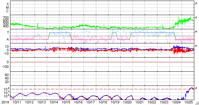 (c) SDO (NASA)、(動画加工 : 宇宙天気ニュース) ![]() SDO衛星のAIA193カメラによる太陽コロナの様子 (c) SDO (NASA) ![]() SDO衛星による太陽の可視光写真 (c) SDO (NASA) ![]() DSCOVRが観測した太陽風の磁場(1番上の枠、黒線は全体の強度、赤線は南北成分) および、太陽風の密度(3番目の紫線)、速度(4番目の青線) (c) データ:NOAA/SWPC、作図:宇宙天気ニュース ![]() AE指数(速報値) 下段のAEグラフの値が高くなると、オーロラ活動が活発化しています。 (c) 京都大学WDC ![]() ![]() 27日の太陽周期に合わせたデータプロット 太陽が同じ面を地球に向けていた27日前の変化から、今後を予想することができます。 (c) 作図:宇宙天気ニュース
