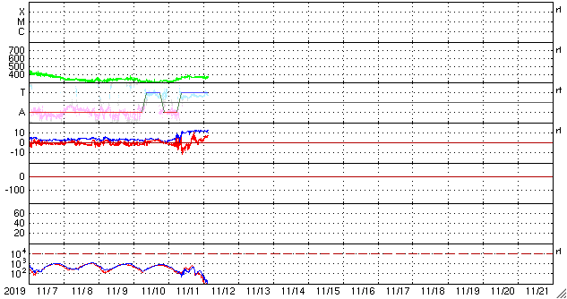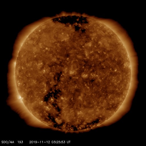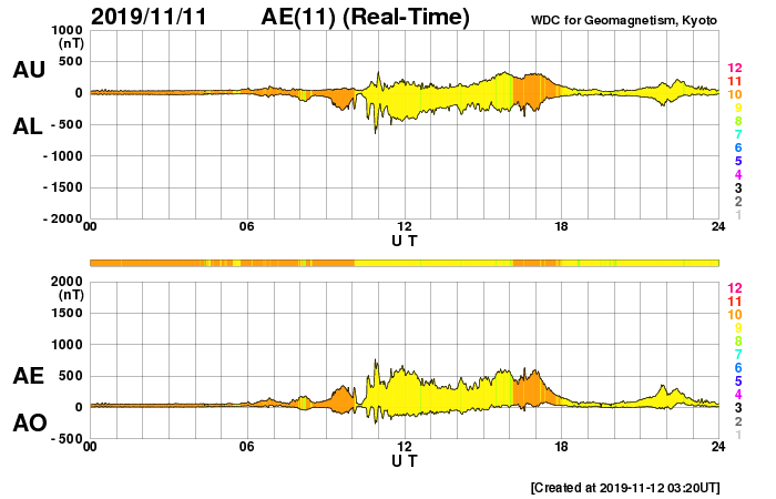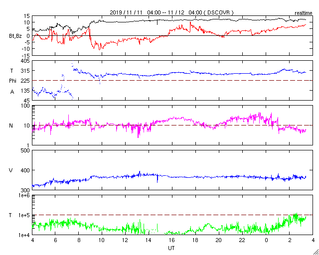 2019/11/12 12:31 更新 太陽風の磁場がやや強まっています。水星の太陽面通過が起きました。 担当 篠原 昨夜から今日未明にかけて、 水星が太陽面を横切る現象が発生しました。 時間帯が悪く、日本では直接見ることができませんでしたので、 SDO衛星の写真を使ってその様子を紹介します。 太陽を左から右に向かって、小さい黒丸が進んでいます。 SDO衛星の紹介ページでは、 より詳しい様々な動画を見ることができます。 どうぞご覧下さい。 太陽風は、昨夕に磁場強度が10nTへ強まり、 現在も12nTにやや強まった状態が続いています。 速度は300km/秒から360km/秒へ少し高まった程度で、 低速の状態が続いています。 磁場の南北成分は、強まり始めに南向きに振れて -10nTに達し、 その後、次第に北向きに変化して、現在は +7nTくらいです。 磁場が南向きに変化した頃に磁気圏の活動もやや高まって、 AE指数に700nTの変化が発生しています。 以降は磁場が北に向き、磁気圏も静かになっています。 太陽は無黒点ですが、 SDO衛星AIA193の太陽の南東の端(左下)から、 明るい領域が見え始めていて、 活動的な領域が現れようとしています。 ここに黒点はできているでしょうか。