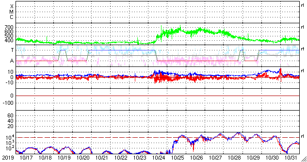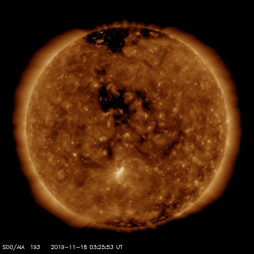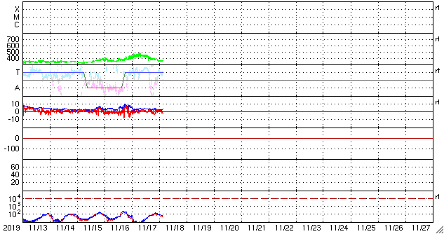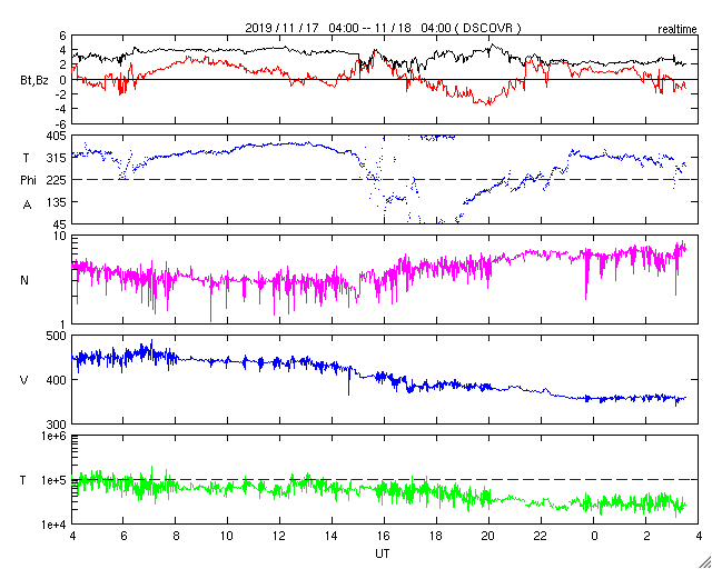 2019/11/18 12:43 更新 太陽風は低速に戻っています。小さい黒点が見えています。 担当 篠原 太陽風の速度は、 昨日いっぱいは440km/秒とやや高まった状態が続きましたが、 今日に入ると下がり始め、 今朝くらいに360km/秒まで下がって、低速の風に戻っています。 磁場強度は、3nT前後とやや弱い状態が続いています。 磁場の南北成分は、全体としては北寄りの傾向で、 磁気圏は静穏です。 AE指数は、400nTの変化が1回起きた程度です。 SDO衛星AIA193では、 コロナホールが太陽の中央部の北半球側に広がっています。 明後日くらいからこの領域の影響が始まりそうです。 27日周期の図では、前周期は10月24日に速度の変化が始まり、 650km/秒まで高まりました。 今回はコロナホールの広がりが少し減っていて、 太陽風への影響は弱くなっているかもしれません。 SDO衛星の可視光写真では、 太陽の南半球の中央部に小さい黒点が見えている様です。 14日のニュースで、 2752と番号が付けられたとお知らせした領域です。 掲載の可視光写真でかろうじて見える程度です。