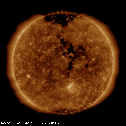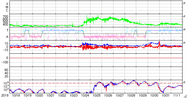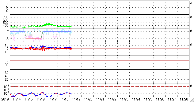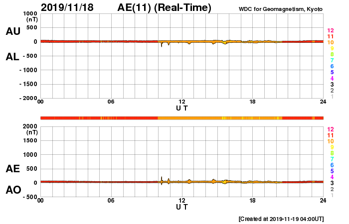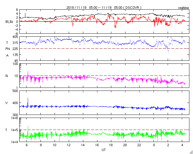 2019/11/19 13:31 更新 太陽風は低速で、磁気圏も穏やかです。明日くらいから太陽風の速度が高まりそうです。 担当 篠原 太陽風の速度は、360km/秒と低速の状態が続いています。 磁場強度も、3nT前後とやや弱い状態です。 磁気圏も静穏で、AE指数はほとんど変化のない状態です。 SDO衛星AIA193では、 太陽の中央部のコロナホールが西に進んでいます。 明日くらいから、この領域の影響で太陽風の速度が高まりそうです。 27日周期の図を見ると、 前周期は10月24日に変化が到来しています。 太陽風の磁場強度が強まって、南向きに変化が強まると、 オーロラの活動も活発になります。 前周期は、24〜28日にかけてAE指数の変化も大きくなりました。 今回はどうなるでしょうか。 太陽は、昨日見えていた小さい黒点は見えなくなっています。 無黒点で、穏やかな状態です。