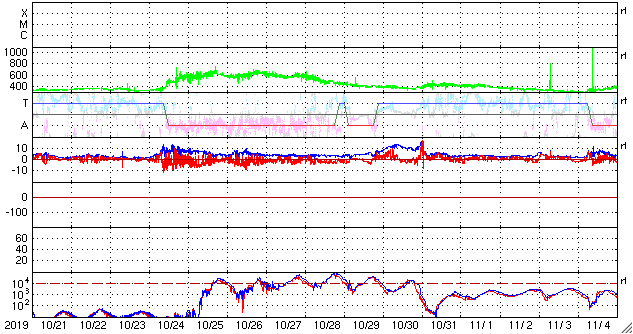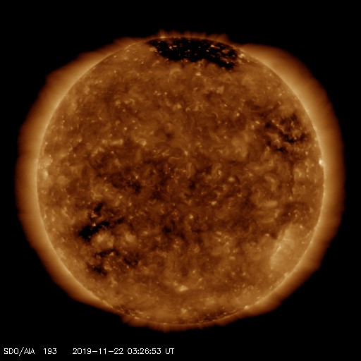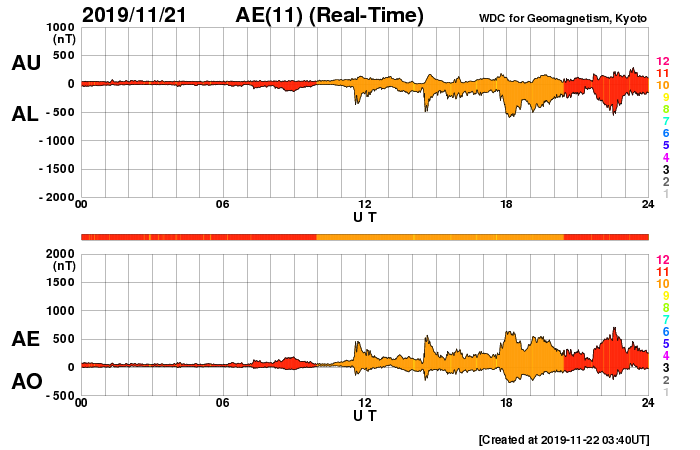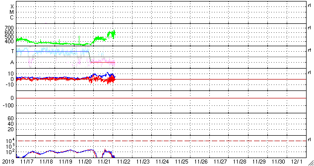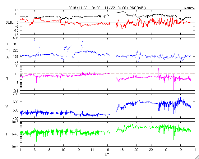 2019/11/22 12:31 更新 太陽風の速度は600km/秒に高まっています。 担当 篠原 太陽風は、今日未明に2回目の速度の高まりがやって来て、 450km/秒から600km/秒へ変化しています。 27日前と同じくらいの高速風になっています。 磁場強度は、速度が高まる頃に10nT程度に強まりましたが、 現在は5nTと平均的な値に戻っています。 磁場の南北成分は、-3nT程度の南向きの変化が続き、 AE指数は500nTの中規模の変化が続くようになっています。 磁気圏は、ある程度活動的になっています。 27日周期の図を見ると、 前周期の高速風は、 10月24日から28日にかけて5日間続いています。 しかし、今回はコロナホールが小さくなっているので、 継続時間も短くなっている可能性があります。 速度の高まりはどこまで続くでしょうか。 太陽は今日も無黒点です。