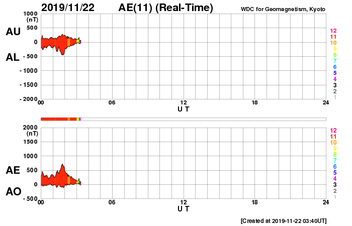 (c) SDO (NASA) ![]() SDO衛星による太陽の可視光写真 (c) SDO (NASA) ![]() DSCOVRが観測した太陽風の磁場(1番上の枠、黒線は全体の強度、赤線は南北成分) および、太陽風の密度(3番目の紫線)、速度(4番目の青線) (c) データ:NOAA/SWPC、作図:宇宙天気ニュース ![]() AE指数(速報値) 下段のAEグラフの値が高くなると、オーロラ活動が活発化しています。 (c) 京都大学WDC ![]() ![]() 27日の太陽周期に合わせたデータプロット 太陽が同じ面を地球に向けていた27日前の変化から、今後を予想することができます。 (c) 作図:宇宙天気ニュース
