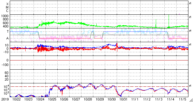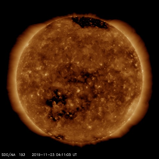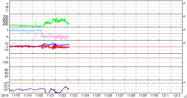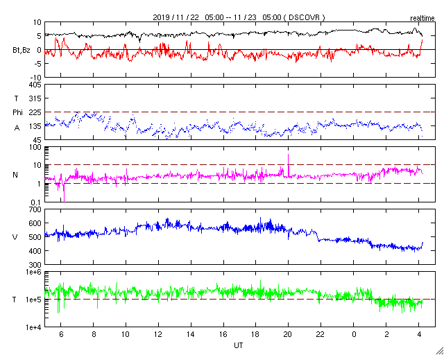 2019/11/23 13:25 更新 高速太陽風は終わり、平均的な速さに戻っています。 担当 篠原 500〜570km/秒と高速の状態が続いていた太陽風は、 今朝から速度が下がり始め、 現在は400km/秒と平均的な速さに戻っています。 磁場強度は、5〜6nTと平均的な状態です。 磁場の南北成分は、弱い南寄りになっています。 磁気圏はある程度活動的になっていて、 AE指数は200〜500nTの小規模の変化が 連続的に発生しています。 しかし、太陽風の速度が下がってしまったので、 今後は静かになりそうです。 高速太陽風は、2日続いただけで速度が下がってしまいました。 前周期と比べると、継続時間は半分以下になっています。 コロナホールが小さくなっていたことを考えると、 太陽風はこのまま穏やかになりそうです。 一方、SDO衛星AIA193では、 南東側(左下)にややぼんやりとしたコロナホールが見えています。 ただし、前周期はこの領域による太陽風の高まりは ほとんど見られませんでした。 今回はどうなるでしょうか。 太陽は、SDO衛星の可視光写真を拡大すると、 中央付近にとても小さい黒点が現れている様です。 この後、もっとはっきりした黒点に変化するでしょうか。