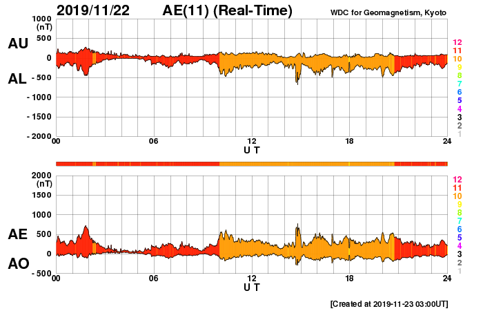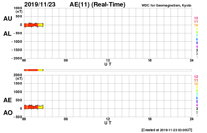 (c) SDO (NASA) ![]() SDO衛星による太陽の可視光写真 (c) SDO (NASA) ![]() DSCOVRが観測した太陽風の磁場(1番上の枠、黒線は全体の強度、赤線は南北成分) および、太陽風の密度(3番目の紫線)、速度(4番目の青線) (c) データ:NOAA/SWPC、作図:宇宙天気ニュース ![]() AE指数(速報値) 下段のAEグラフの値が高くなると、オーロラ活動が活発化しています。 (c) 京都大学WDC ![]() ![]() 27日の太陽周期に合わせたデータプロット 太陽が同じ面を地球に向けていた27日前の変化から、今後を予想することができます。 (c) 作図:宇宙天気ニュース