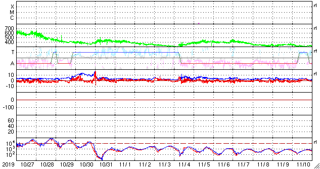 磁場強度は、4〜5nTと平均的な状態です。