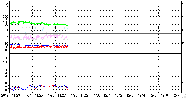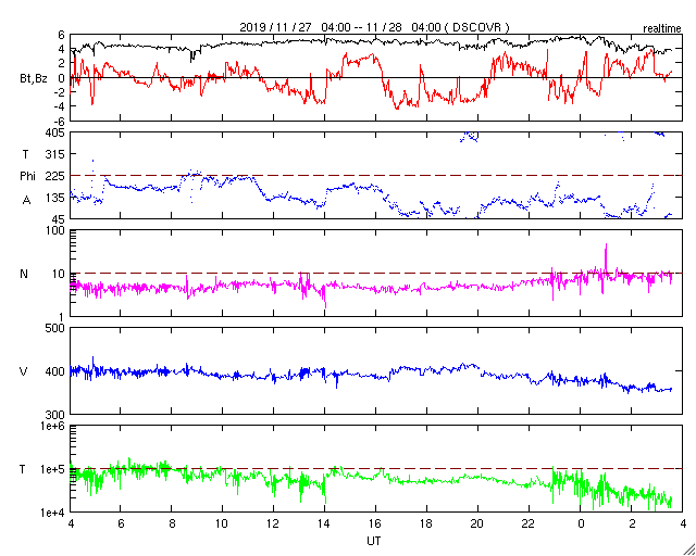 - 2019/11/27 12:09 太陽風は平均的な状態で、磁気圏も穏やかです。