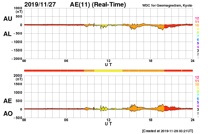 下段のAEグラフの値が高くなると、オーロラ活動が活発化しています。
