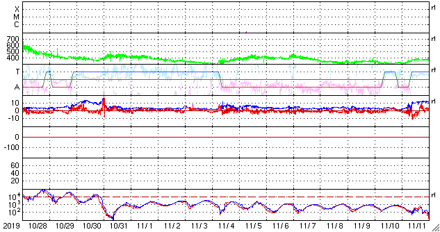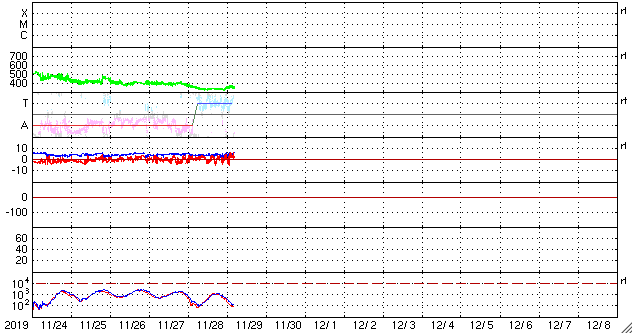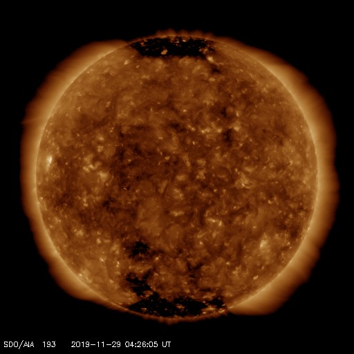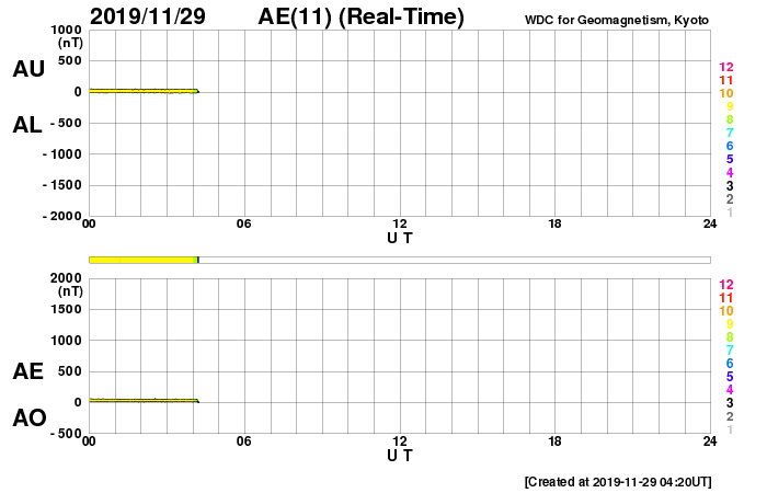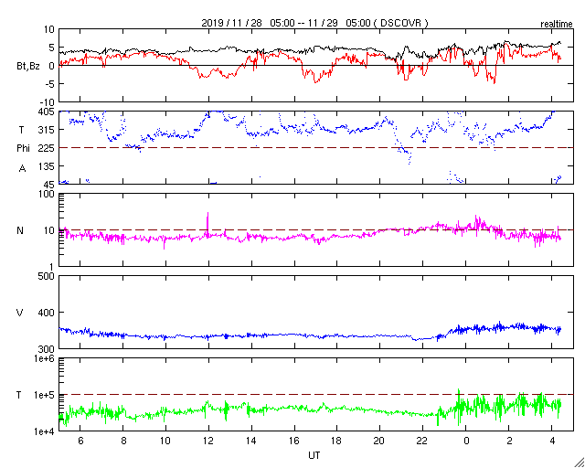 2019/11/29 13:34 更新 太陽風は低速で、磁気圏も穏やかです。太陽は無黒点が続いています。 担当 篠原 太陽風の速度は、350km/秒から330km/秒へ少し下がり、 また350km/秒に戻るという小幅の変化をしています。 低速の状態が続いています。 磁場強度は、4〜5nTと平均的な状態です。 磁場の南北成分は、 南に振れたり、北に振れたりを繰り返しています。 南向きになった時間帯に、 AE指数は小さい変化を起こしていますが、 その他は穏やかな状態が続いています。 SDO衛星AIA193では、低緯度域にコロナホールはなく、 太陽風は穏やかに推移しそうです。 太陽は無黒点です。 昨日紹介していた東端の領域は、 今日も白斑が見えるだけで、黒点はありませんでした。