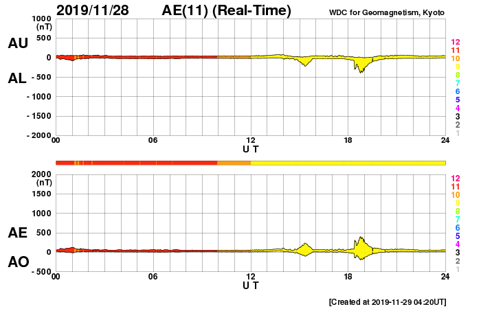 (c) SDO (NASA) ![]() SDO衛星による太陽の可視光写真 (c) SDO (NASA) ![]() DSCOVRが観測した太陽風の磁場(1番上の枠、黒線は全体の強度、赤線は南北成分) および、太陽風の密度(3番目の紫線)、速度(4番目の青線) (c) データ:NOAA/SWPC、作図:宇宙天気ニュース ![]() AE指数(速報値) 下段のAEグラフの値が高くなると、オーロラ活動が活発化しています。 (c) 京都大学WDC ![]() ![]() 27日の太陽周期に合わせたデータプロット 太陽が同じ面を地球に向けていた27日前の変化から、今後を予想することができます。 (c) 作図:宇宙天気ニュース