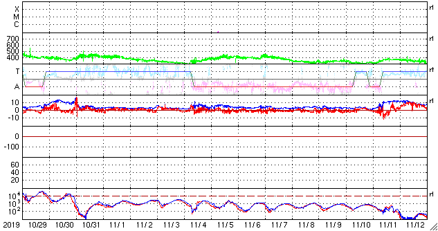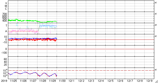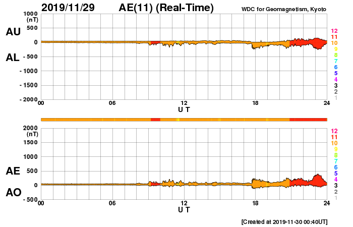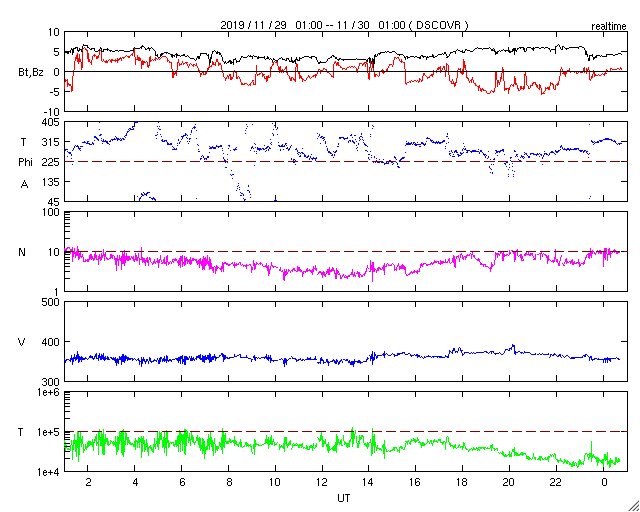 2019/11/30 09:57 更新 低速の太陽風が続いています。磁気圏も穏やかです。 担当 篠原 太陽風は、350〜370km/秒と低速の風が続いています。 磁場強度も、5〜3nTと平均的かやや弱い状態です。 穏やかな太陽風が続いています。 磁場の南北成分は、 グラフの後半で -5nT程度の南向きが続く時間帯があり、 AE指数に200〜300nTの小規模の活動が発生しています。 その他は特に変化はなく、 低速の太陽風が続いているので、 磁気圏は全体としては穏やかに推移するでしょう。 27日周期の図を見ると、前周期の太陽風は、 11月5〜7日にかけて速度が400km/秒台へ少し高まっています。 たいした変化ではありませんが、 今回も同様の変化が見られるでしょうか。 明日くらいから注目してください。 太陽は無黒点で穏やかです。 ![]() SDO衛星のAIA193カメラによる太陽コロナの様子 (c) SDO (NASA) ![]() SDO衛星による太陽の可視光写真 (c) SDO (NASA) ![]() DSCOVRが観測した太陽風の磁場(1番上の枠、黒線は全体の強度、赤線は南北成分) および、太陽風の密度(3番目の紫線)、速度(4番目の青線) (c) データ:NOAA/SWPC、作図:宇宙天気ニュース ![]() AE指数(速報値) 下段のAEグラフの値が高くなると、オーロラ活動が活発化しています。 (c) 京都大学WDC ![]() ![]() 27日の太陽周期に合わせたデータプロット 太陽が同じ面を地球に向けていた27日前の変化から、今後を予想することができます。 (c) 作図:宇宙天気ニュース